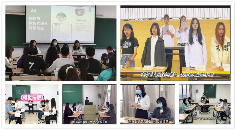 另一项是在学生中分小组开展民法典模拟小法庭活动。马克思主义学院根据通知要求和思政课教学安排,在学生中按8-10人分组开展民法典模拟小法庭,并拍摄成微视频进行展播分享。模拟法庭需要学生先熟悉民法典法条,分析民法案例案情,撰写模拟法庭文书;之后由组员分别扮演审判长、书记员、律师、案件当事人、其他诉讼参与人等。准备工作做好后再利用课外或课堂时间模拟开展案件庭审过程。最后还要拍摄制作成10分钟左右的微视频展播分享。整个实践过程,小组每一位学生都要参与到模拟法庭活动中,极大地加深了学生对民法典知识的学习和掌握,锤炼了他们的法治思维,提升了法治素养,促进了民法典内化于心、外化于行。