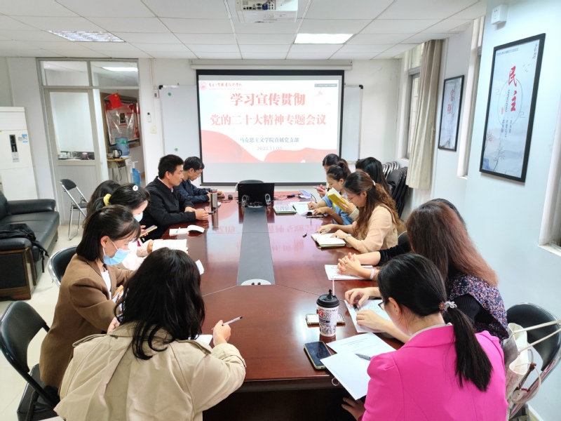 2022年11月3日下午,马克思主义学院召开学习宣传贯彻党的二十大精神专题会议,马院负责人宁晓菊及部门教师,通过线下和线上两种方式,集体参加了此次专题学习会议。
