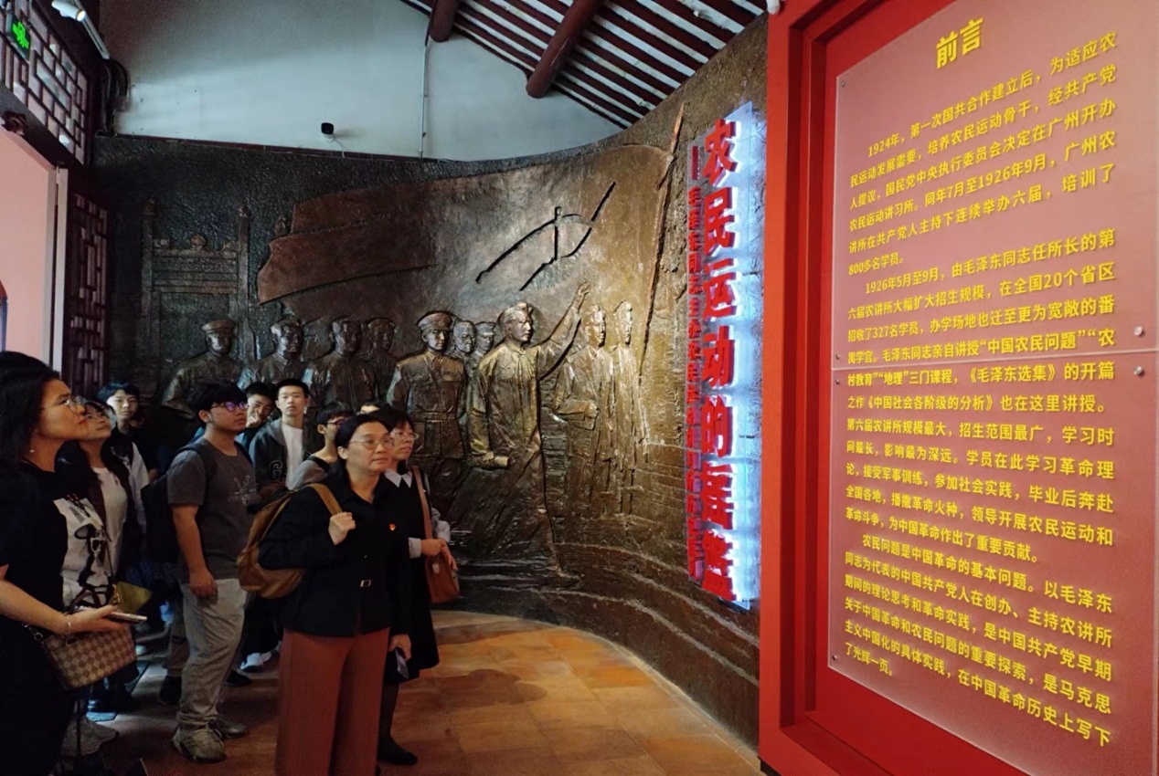 为深入推进习近平新时代中国特色社会主义思想“进教材、进课堂、进头脑”,切实贯彻落实教育部等十部门印发的《全面推进“大思政课”建设的工作方案》,充分利用红色资源、传承红色基因,建设思政“大课堂”、搭建“大平台”、建好“大师资”,10月20日,我校马克思主义学院院长宁晓菊教授、副院长刘凤梅教授带领部分师生赴毛泽东同志主办农民运动讲习所旧址纪念馆(以下简称“农讲所纪念馆”)进行参观合作交流。