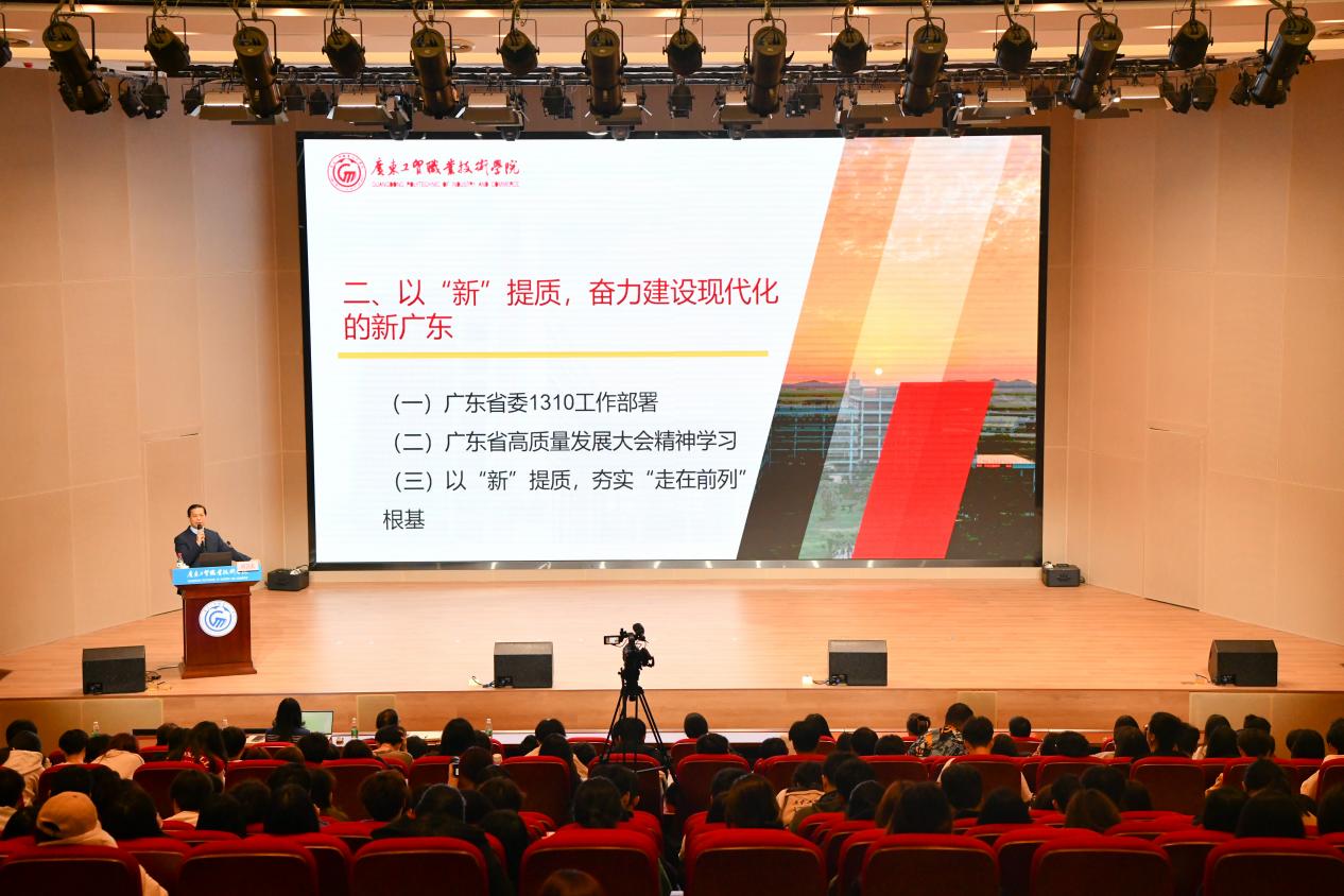 授课的第三部分讲述了职业院校和学子们如何把握机遇,在实现现代化新广东实践中履行使命担当,展现工贸作为。何汉武指出,未来我校将围绕数字产业化和产业数字化变革,在人才培养目标、教学内容、教学手段等方面实施数字化转型和数字赋能,培养适应产业发展所需的人才,为广东高质量发展提供人才和技术支撑。同时,何汉武鼓励工贸学子要兼具家国情怀和世界眼光,把握职业教育前景广阔的发展机遇,勇于创新,乐于创新,善于创新,积极投身于中国式现代化的广东实践,努力成为新质生产力发展的高素质技术技能人才。
