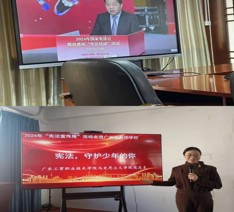 此外,马克思主义学院在宪法宣传周举行的其他活动包括:部分教师和学生代表于124日在天河校区西区中心会议室参加了教育部举办的“宪法晨读”直播活动;张薇薇和毛玲老师赴广州市启明学校开展宪法专题讲座。