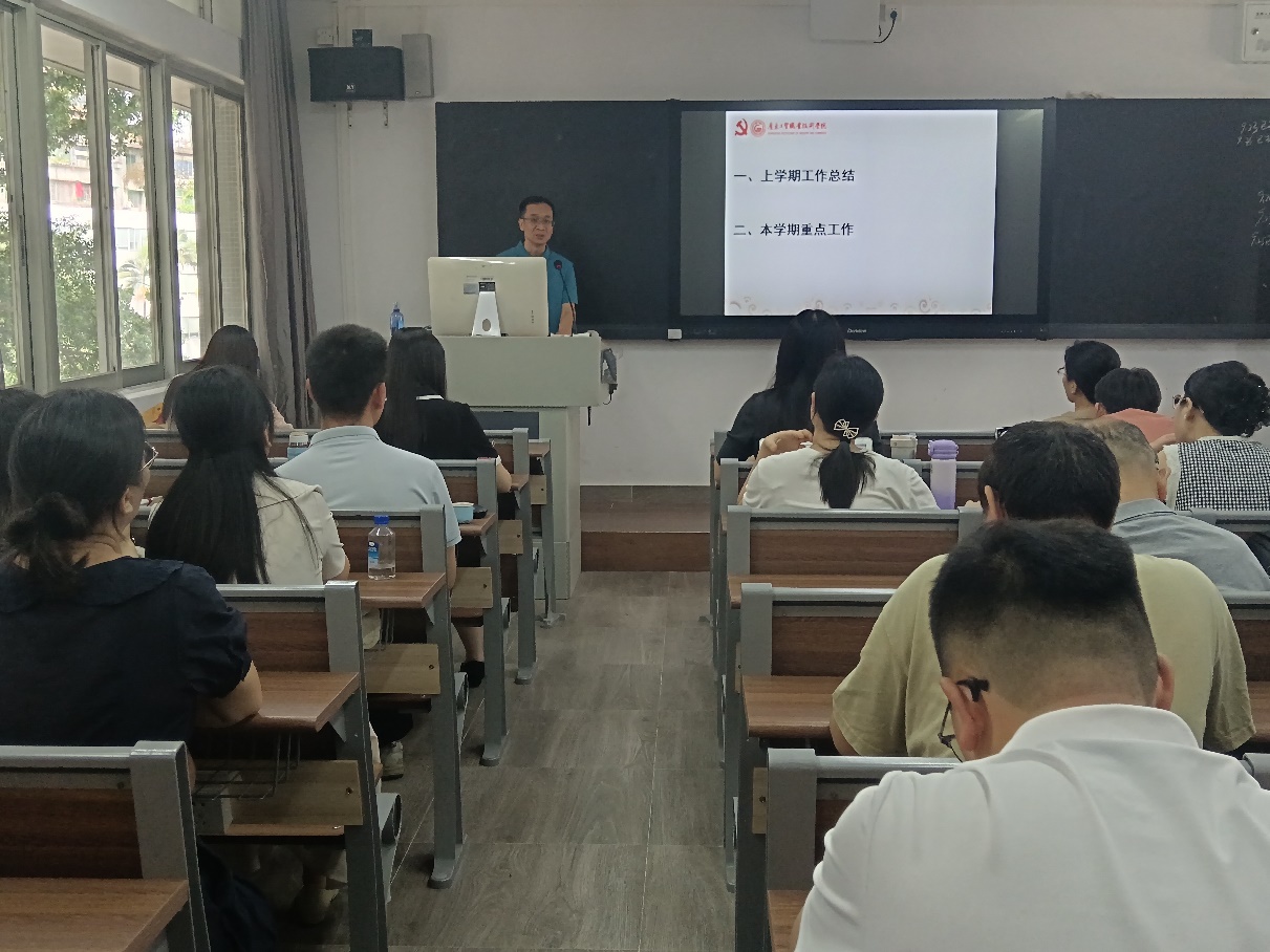 2025年9月28日下午,马克思主义学院在天河校区东区教学楼302教室召开部门工作会议,并举办2025年广东省大中小学思政课一体化教学展示交流活动校级选拔赛。会议围绕教学提质、制度优化、赛事筹备三大核心任务展开部署,为新学期思政课建设与学院发展明确方向、凝聚共识。会议由副院长贾云飞主持,马克思主义学院全体教师参加了会议。
