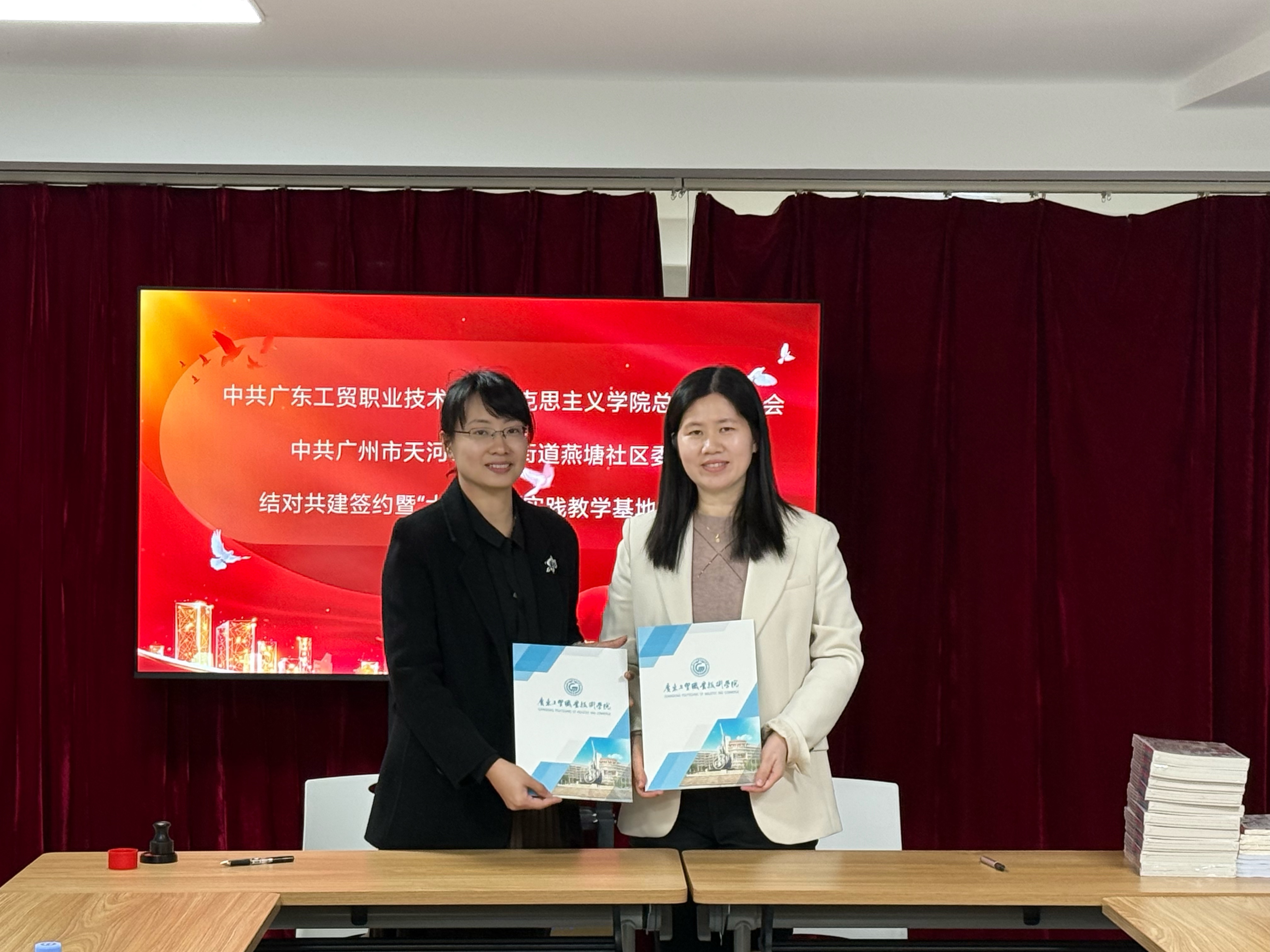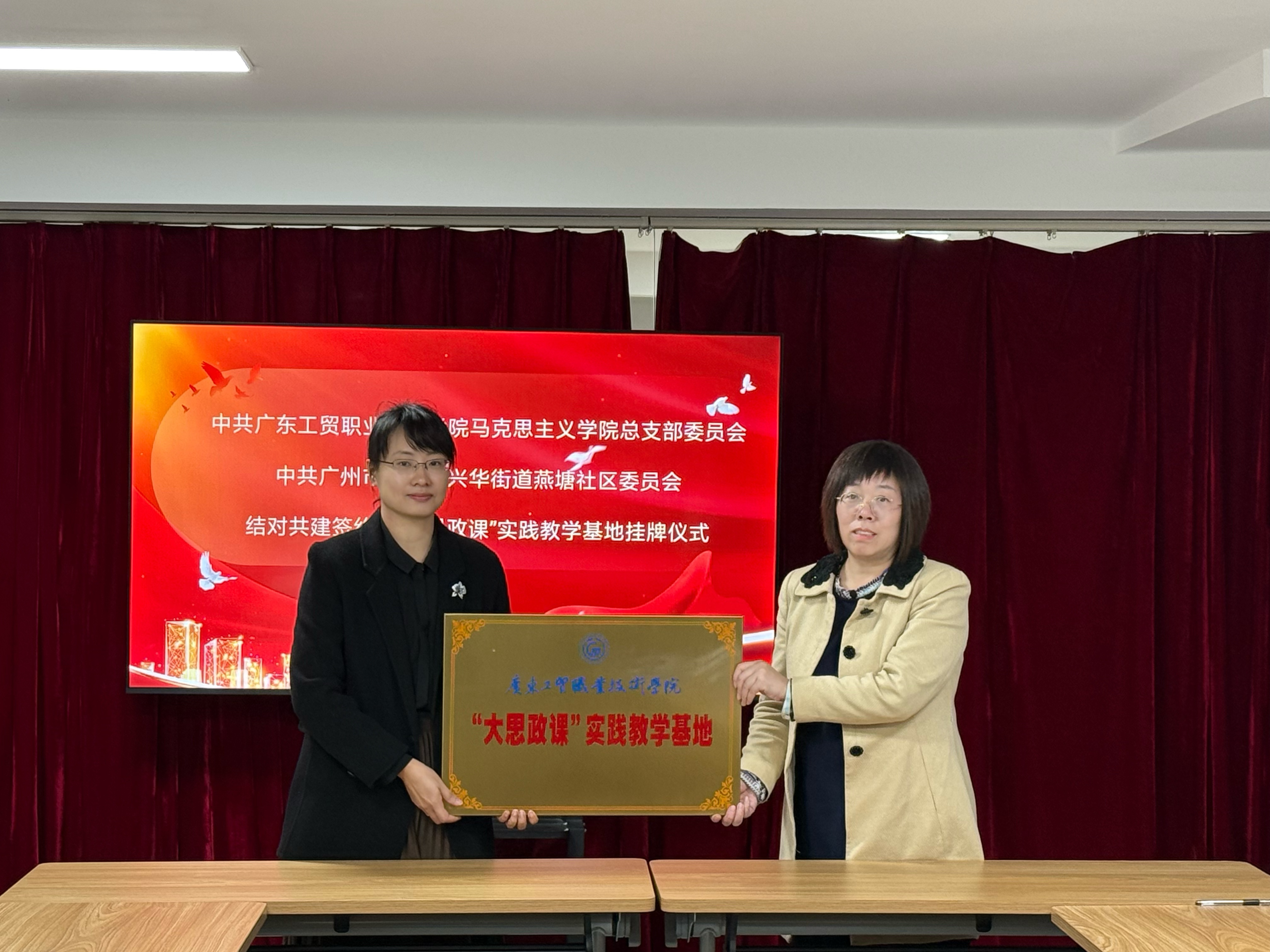 2025年12月2日下午,我校马克思主义学院与广州市天河区兴华街道燕塘社区在天河区燕塘社区党群服务中心举行党建共建暨“大思政课”实践教学基地授牌仪式。兴华街道党工委副书记涂智玮,燕塘社区党委书记、社区居委会主任房韵莉,燕塘社区专职工作人员廖富瑾、兴华街道社工站社工周秀茹,我校马克思主义学院党总支书记张巧平,院长刘凤梅,各教研室主任和教师代表参加了活动。