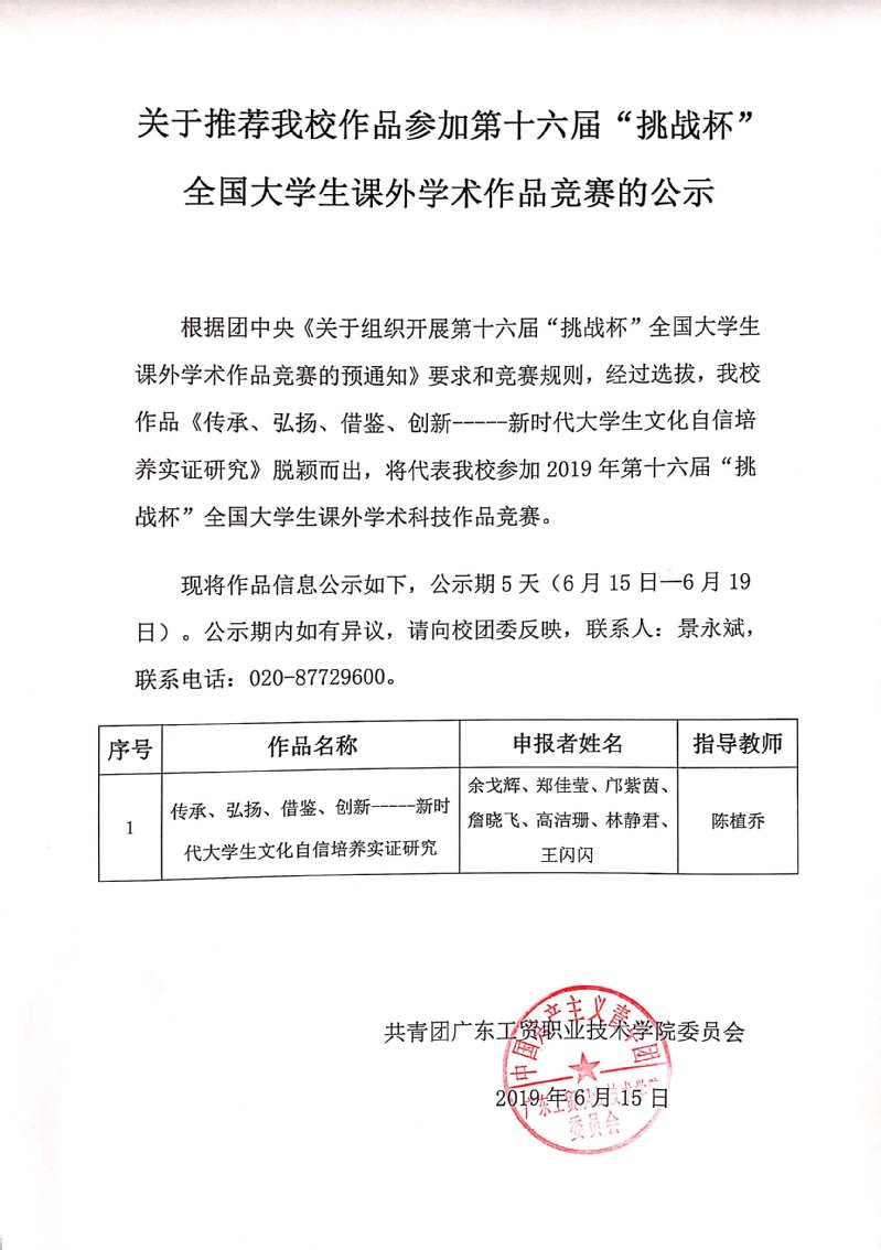 关于推荐我校作品参加第十六届“挑战杯”全国大学生课外学术作品竞赛的公示