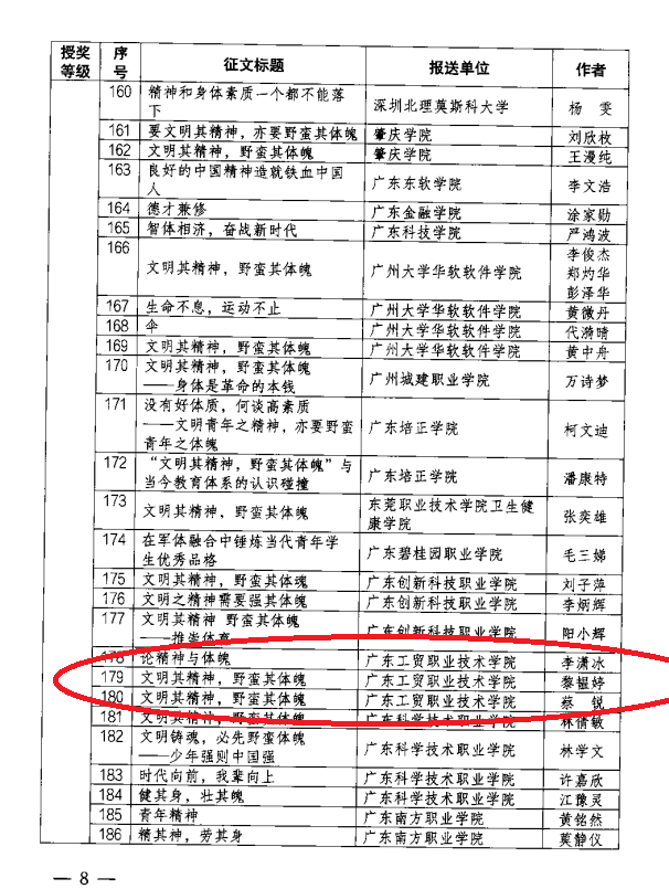 近日,由广东省教育厅举办的“文明其精神、野蛮其体魄”主题案例征集和征文活动,经公示无异议,公布了获奖名单。我校师生踊跃参与,最终共5名学生获得了学生组征文奖项,其中二等奖(示范征文)2名、三等奖(优秀征文)3名。