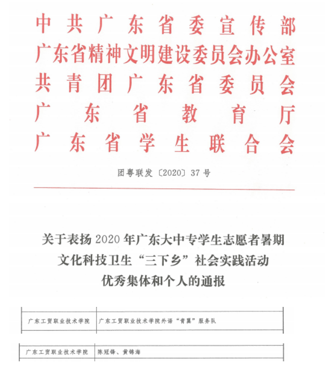 2020年广东大中专学生志愿者暑期文化科技卫生“三下乡”社会实践活动评选结果近日公布,我校应用外语学院“青翼”服务队获评“优秀实践团队”称号,校团委书记陈冠锋老师、工商管理学院黄锦海同学获评“优秀个人”称号。