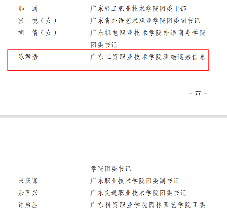 在建团100年之际,我校共青团工作传来喜讯。近日,根据团省委公布的《关于表彰2021-2022年度广东省五四红旗团委(标兵)、五四红旗团支部(标兵)、优秀共青团员和优秀共青团干部的决定》(团粤发【2022】14号),学校应用外语学院19旅游英语专业2班团支部荣获“广东省五四红旗团支部”称号,测绘遥感信息学院团委书记陈君浩荣获“广东省优秀团干部”,经济贸易学院2019级市场营销专业梁淑琪、测绘遥感信息学院2019级房地产检测与估价专业杨紫薇、汽车工程学院2019级电子信息工程技术杜冰淼等3名学生荣获“广东省优秀共青团员”称号。