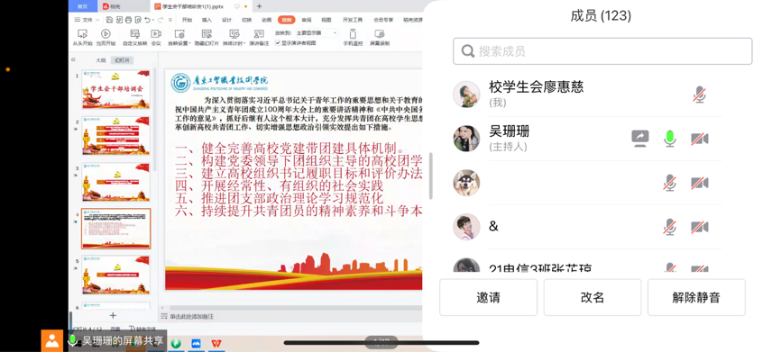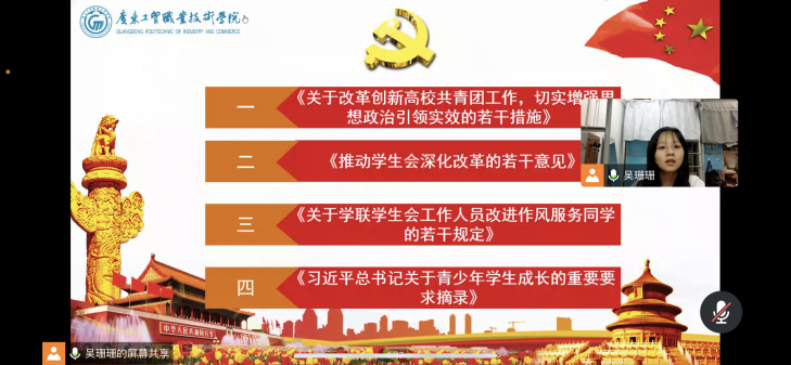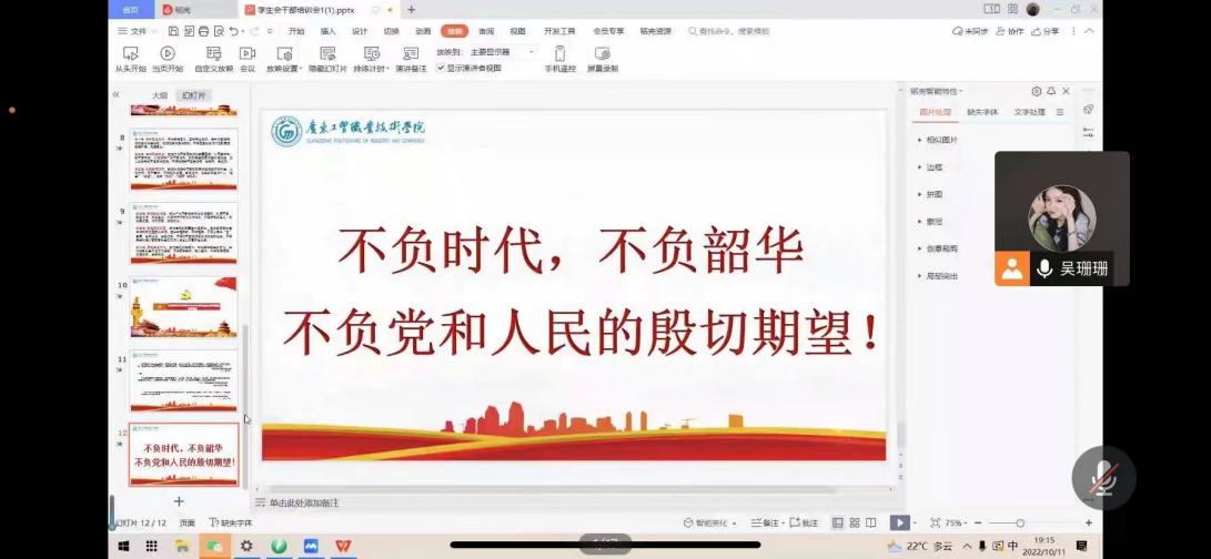 高举习近平新时代中国特色社会主义思想伟大旗帜,全面贯彻党的十九大和十九届历次全会精神,深入贯彻习近平总书记关于青年工作的重要思想和关于教育的重要论述以及对广东系列重要讲话、重要指示精神,贯彻落实广东省第十三次党代会精神和全国学联第二十七次代表大会精神,筑牢理想信念根基,践行服务同学宗旨,深化改革创新,勇担时代使命,团结带领南粤学子坚定跟党走、奋进新时代,为广东在全面建设社会主义现代化国家新征程中走在全国前列、创造新的辉煌贡献青春力量!我校于2022年10月12日晚19:00在腾讯会议组织校院两级学生会组织工作人员开展了学生会干部培训会议。