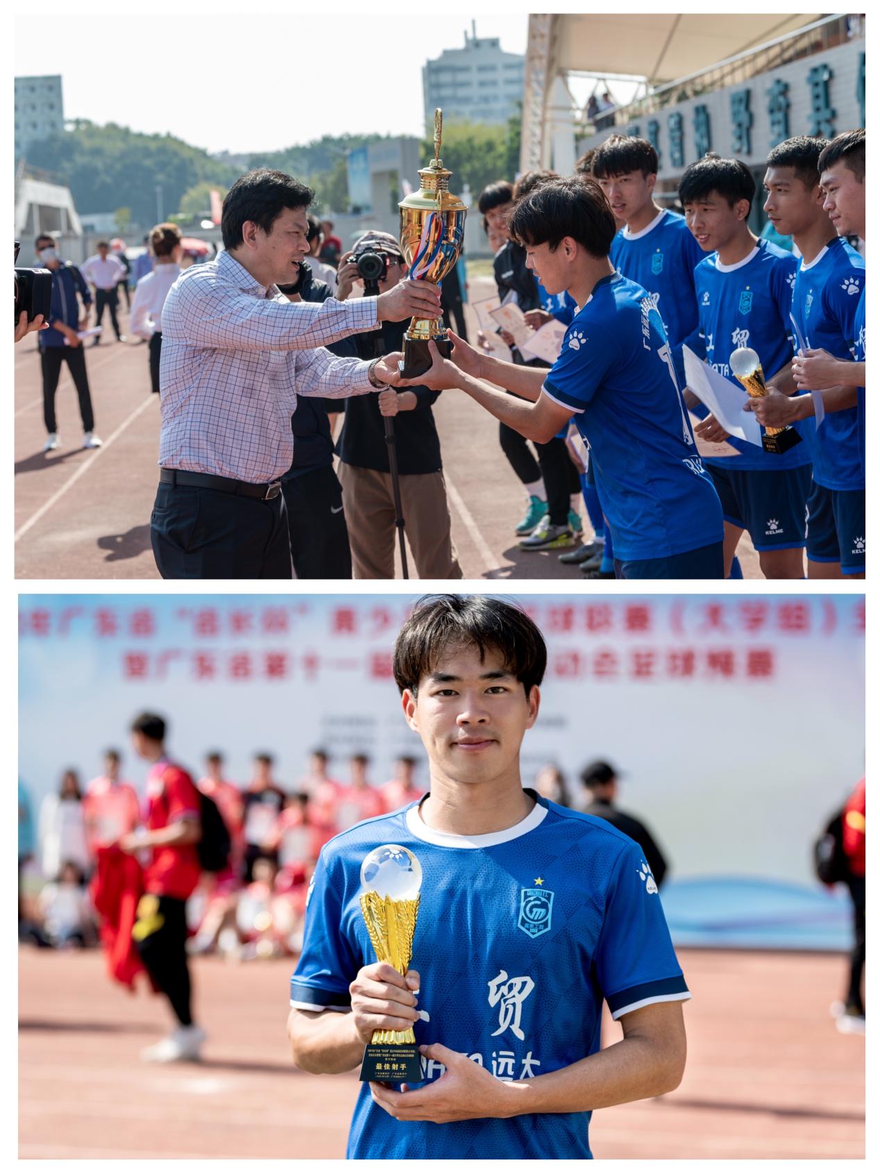 我校派出体艺部吴云主任为领队,李耀辉为主教练、黄权章为助理教练,带领工贸足球队在绿茵丛中激烈奋战,经过多轮的厮杀后与广州南洋理工职业学院会师总决赛的现场。总决赛当晚在广体传媒广播电视台全程直播,球场上的对决紧张刺激、扣人心弦,我校足球队在进一个球之后以凌空抽射之势再下一城,彻底点燃了场内外的气氛,最终工贸以2:0战胜广州南洋理工职业学院,成功卫冕本届赛事男子丙组冠军!我校体艺部李耀辉、黄权章两位老师获“优秀教练员”称号,经济贸易学院温国超获本次“最佳射手”称号。