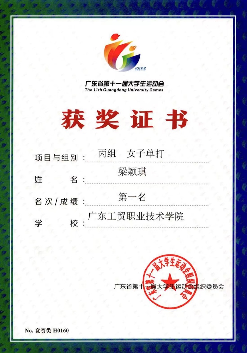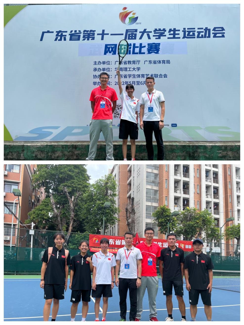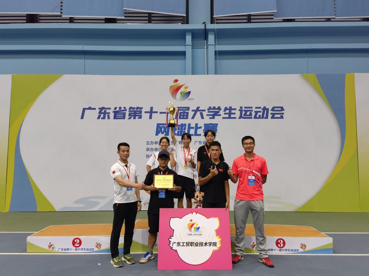 5月30日上午,在华南理工大学五山校区举行的广东省第十一届大学生运动会网球丙组女子单打比赛中,我校经贸学院19级学生国贸专业学生梁颖琪不负众望,在赛场上英勇拼搏,最终以6:1的比分击败来自食品药品职业技术学院的选手,勇夺桂冠!赢得我校在本届省大运会上的首枚金牌!体艺部刘羽老师、测绘学院刘楚泽老师获优秀教练员称号。