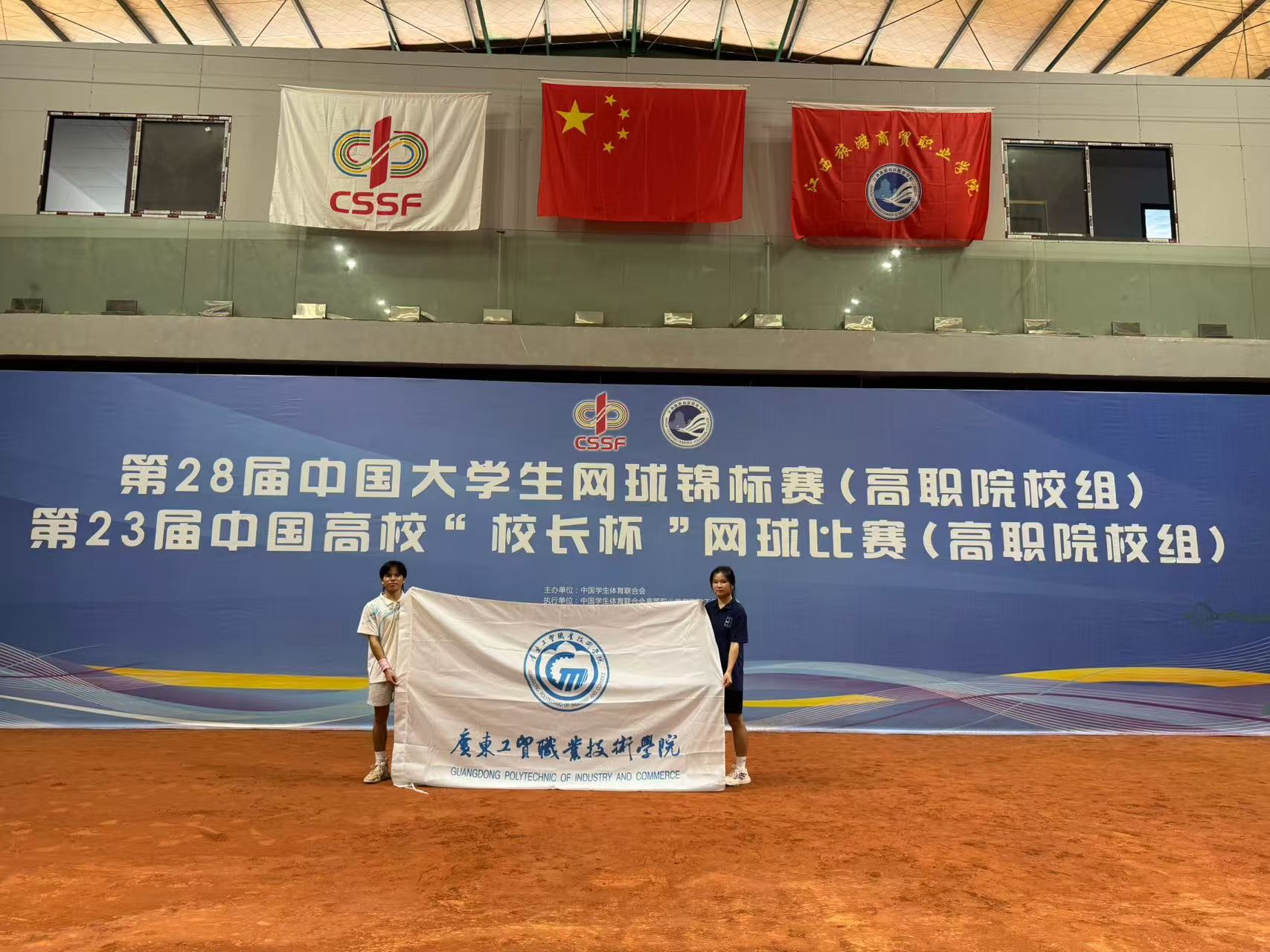 热血挥洒赛场,拼搏铸就荣光。2025 年 7 月 25 日,在江西南昌中昌红网运动中心落幕的第 28 届中国大学生网球锦标赛(高职院校组)上,我校网球队传来捷报——周艾纯(22 电商 7 班)、钟谱城(22 新能源 2 班)这对组合,在刘羽、刘楚泽两位老师的悉心指导下,于强手如林的乙 A 组混双赛场上奋勇拼搏、披荆斩棘,最终勇夺季军,为学校赢得了荣誉!