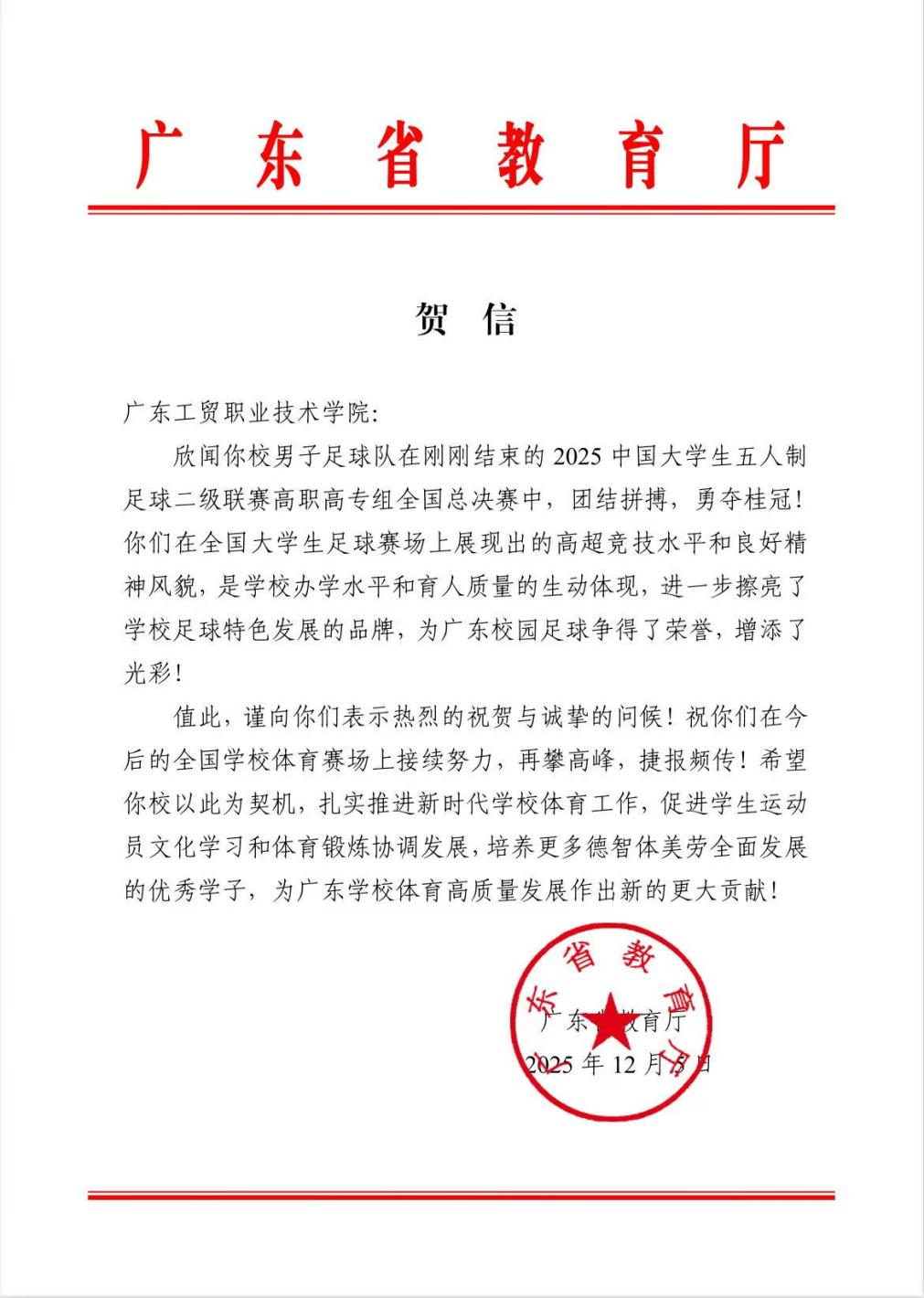 赛事捷报传来,广东省教育厅发来贺信,向我校及男子足球队致以热烈祝贺与诚挚问候。贺信高度肯定球队展现的高超竞技水平与良好精神风貌,指出此次夺冠是学校办学水平和育人质量的生动体现,进一步擦亮了学校足球特色发展品牌,为广东校园足球赢得荣誉。同时,教育厅寄语我校以此次夺冠为契机,扎实推动新时代学校体育工作发展,促进学生运动员文化学习与体育锻炼协调发展,培育更多德智体美劳全面发展的优秀学子,为广东学校体育高质量发展作出新的更大贡献。