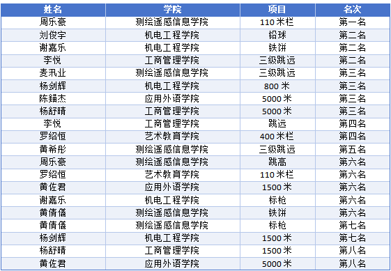铜牌(4项):麦汛业(测绘遥感信息学院)获三级跳远第三名;杨剑辉(机电工程学院)获800米第三名;陈錨杰(应用外语学院)、杨舒晴(工商管理学院)分获男、女子5000米第三名。