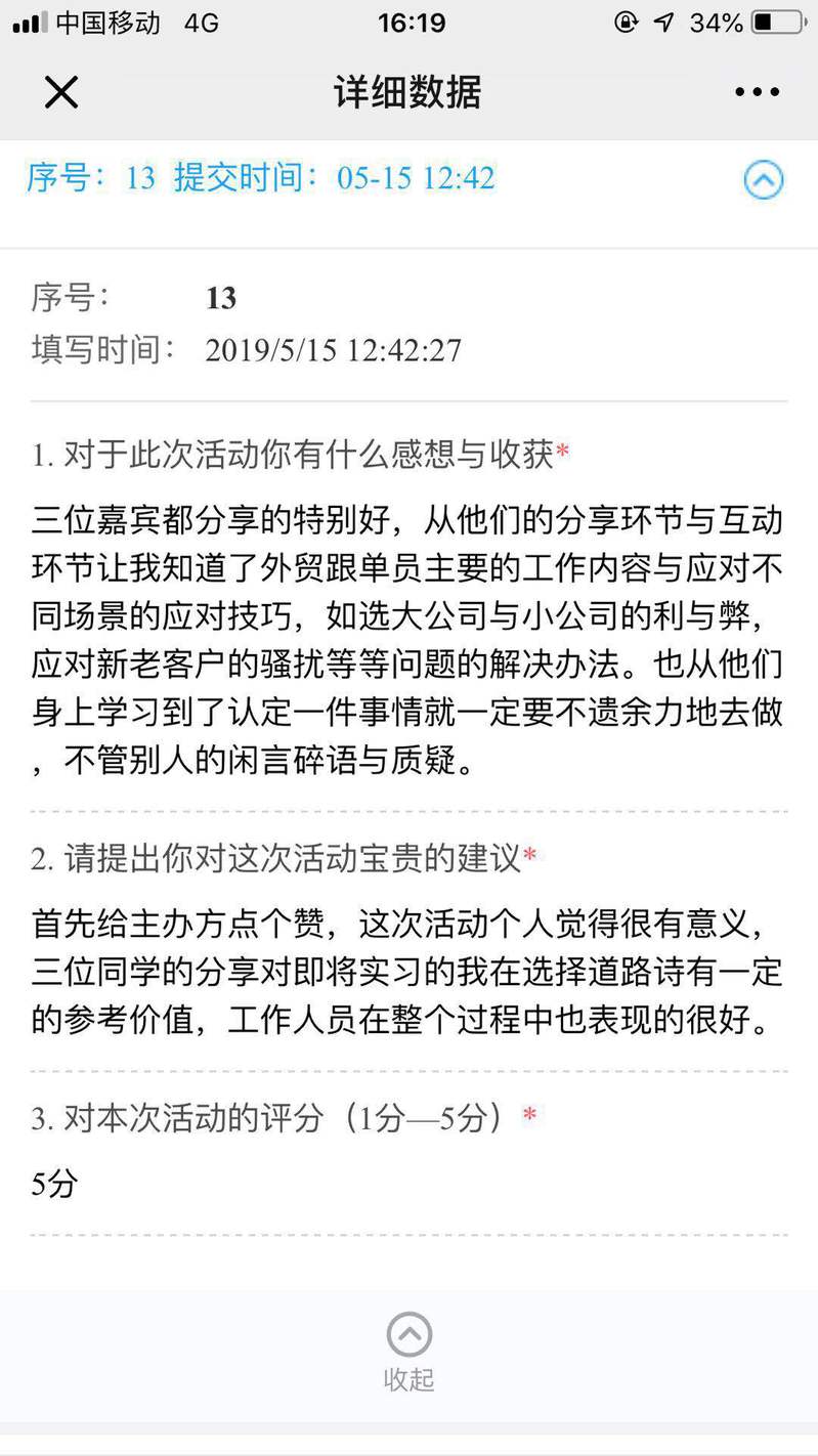 本次实习经验分享沙龙的组织获得嘉宾与报名观众的一致认可,他们希望学校可以持续开展这样一些有意义、有特色的精品活动。应用外语学院将继续坚持以立德树人为根本,坚持开展的各项工作做到“围绕学生 关照学生 服务学生”,助力学生成长成才。