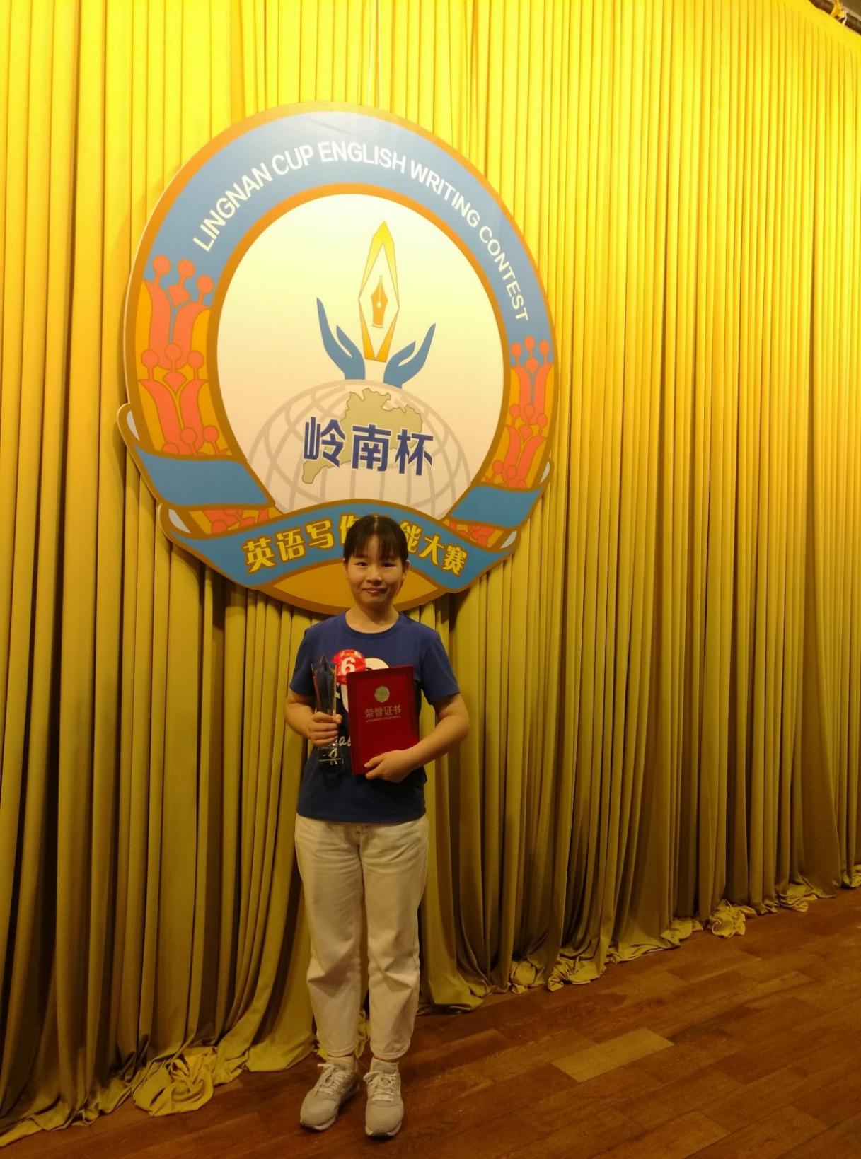 本次复赛采取运用写作技能和语法知识的笔试形式,产生三等奖与优秀奖,并选出晋级决赛的选手。决赛通过作文要点阐述和答辩、英语国家文化和写作知识问答、现场看图写作这三轮比赛决出特等奖、一等奖和二等奖。宁澳凭借流利的口语和流畅的答辩高分晋级最后两轮比赛。可惜在第二轮知识问答环节,过于紧张,错了两题,三轮比赛总分跟特等奖第二名选手仅仅相差1.6分落选,夺得一等奖。由于岭南杯写作比赛赛制复杂,考验选手的英语基础、口语、写作等综合素质,能晋级决赛最后两轮的选手实力可见一斑。