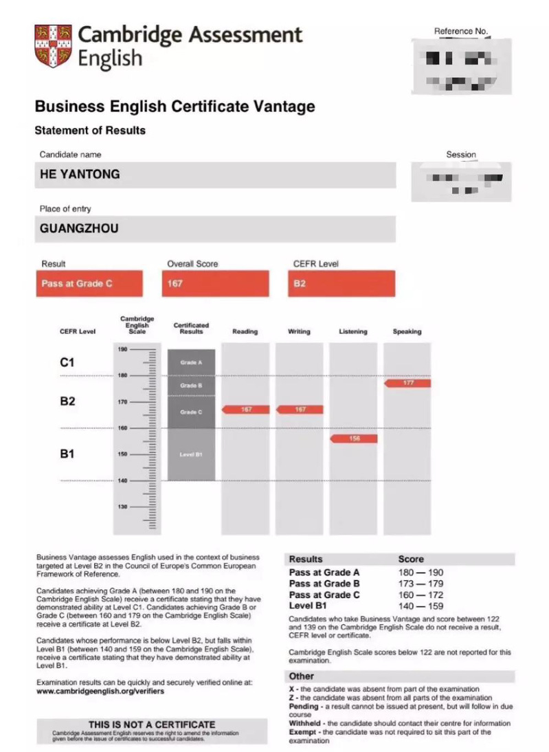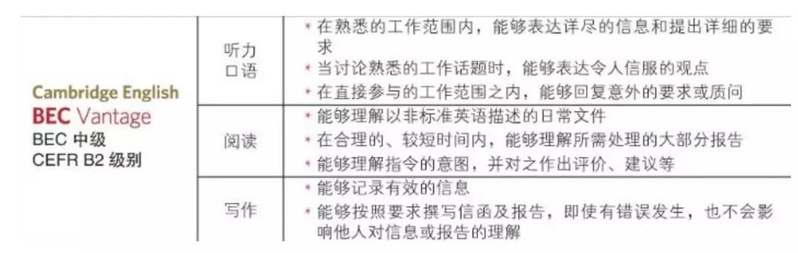 BEC并不会像四六级一样给出具体的分数,而只会给出相应的等级。BEC听、说、读和写四个部分,每一部分各占25%,总分为100%。以BEC中级为例,通过等级:A、B、C;未通过等级:B1(未通过BEC中级,但将获得B1级剑桥英语证书)、F(未通过)。