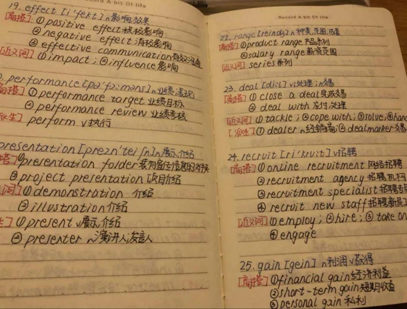 师姐在五个多月的备考日子里,每天坚持挪出1小时进行专题复习,每部分题型都有专门的笔记本和错题本。笔记本是用来记下重点难点考点和题型解答方法,错题本记录错题,找出做题规律。阅读和听力两部分对师姐来说是薄弱点,所以大部分时间都花费在这两方面,关于阅读,师姐每天都花一个小时练一整套阅读卷子,做完以后对答案,把错的找出原因并用笔记本记录下来。