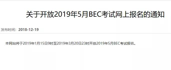 BEC每年会组织两次考试,上半年的五月有“BEC高级”的考试,六月有“BEC中级”;而下半年十一月有“BEC高级”,十二月有“BEC初级”和“BEC中级”。如果有报考的意愿,建议提前2-3个月到官网上去看看,报名通道开通了即可报名。大家可登录剑桥商务英语考试网址进行注册报名。