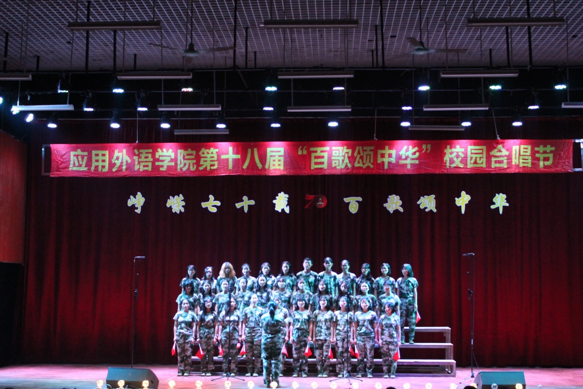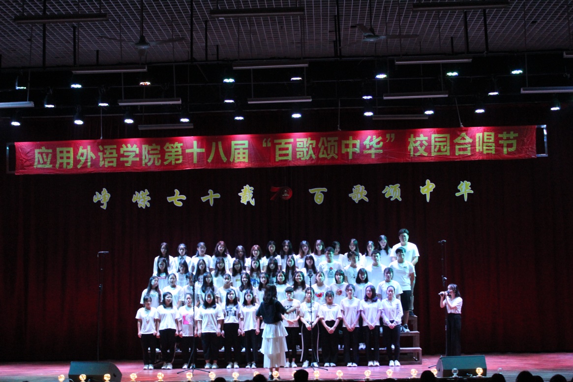 此次比赛应用外语学院全体成员都参与其中,候场班级跃跃欲试,台上班级群情激昂,上场的每一位同学,都将饱满的感情融入歌曲,表达对祖国母亲的热爱和祖国山河的眷恋。精彩的合唱赢得了观众热烈的掌声,也获得了评委嘉宾的青睐。