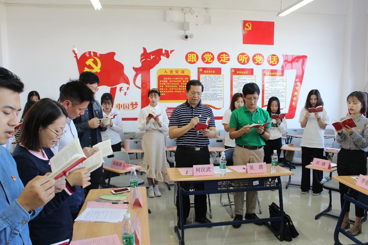 会上,校长何汉武带领全体师生齐声诵读《中国共产党章程》。诵读中,师生们严肃认真,声音洪亮有力,认真领会党章的内容。诵读的声音充溢着整个教室,党的理论滋润着每个人的心田。