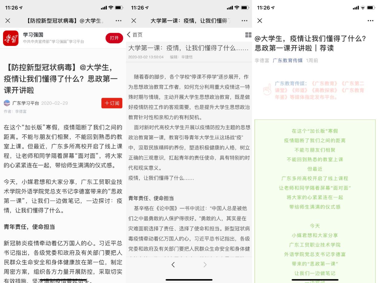 学习强国广东学习平台、新快报、广东教育传媒转载文章《@大学生,疫情让我们懂得了什么?思政第一课开讲啦》