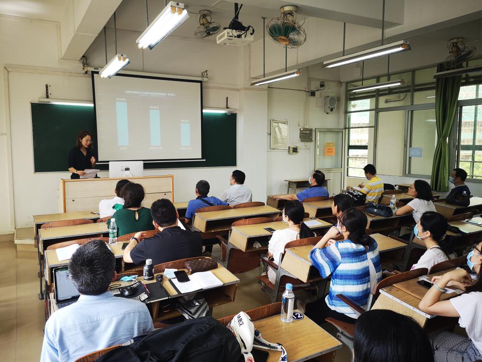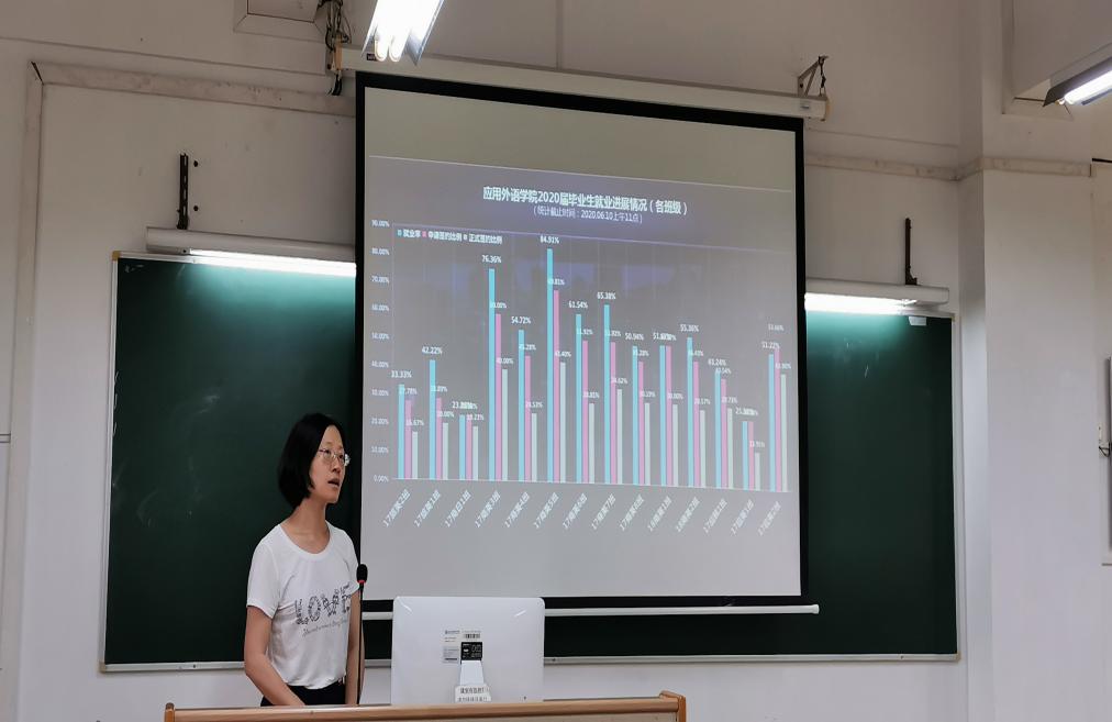 会议开始,毕业班辅导员刘婵向全体人员汇报目前外语学院毕业生就业创业情况工作及各专业、各班级具体就业情况及签约情况;17应英2班班主任龚轶敏老师针对毕业生就业工作进行了交流,分享了要提前给班级同学强调今年疫情之下严峻的就业形势、给班级干部分配任务、精准关心学生就业意向并推送招聘信息、督促学生申请电子就业协议等相关内容;通用英语系主任肖铁蕾就目前毕业生依然存在的就业目标不明确、就业积极性差等问题进行交流。