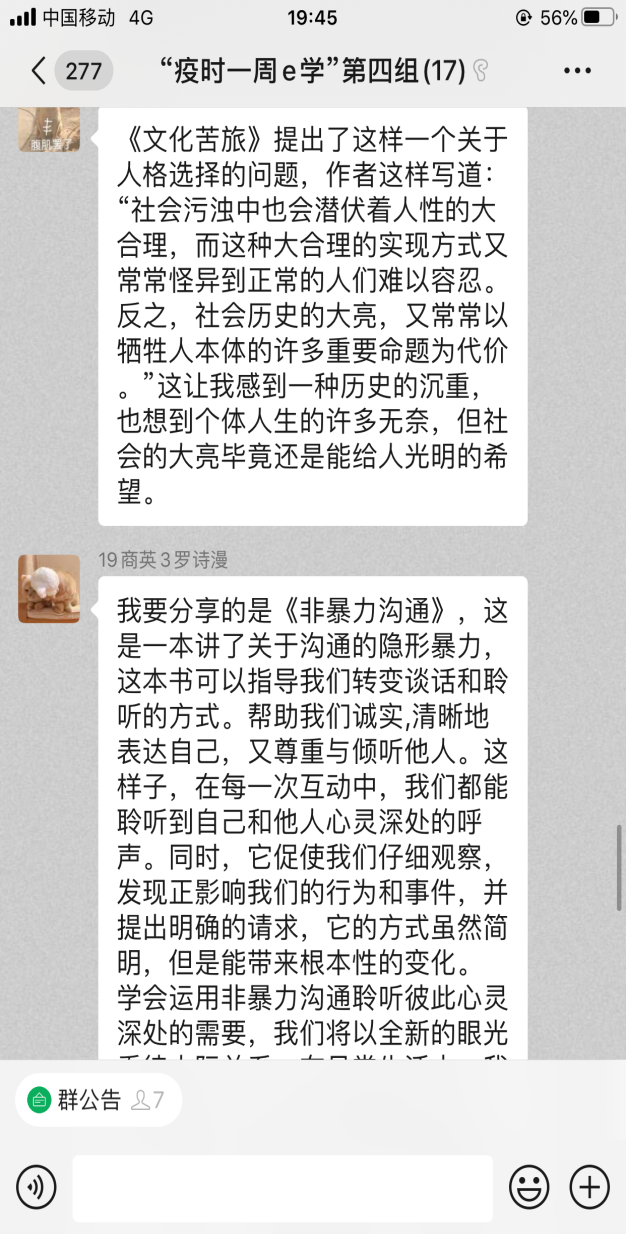 习近平总书记曾说:"要提倡多读书,建设书香社会,不断提升人民思想境界,增强人民精神力量,中华民族的精神世界就能更加厚重深邃。" 为引导同学爱读书,读好书,善读书,传承和弘扬中华优秀传统文化,应用外语学院党群活动中心组织开展第五次“疫”时一周e学活动:“品读好书,汇聚精神力量”——一本好书线上分享会。