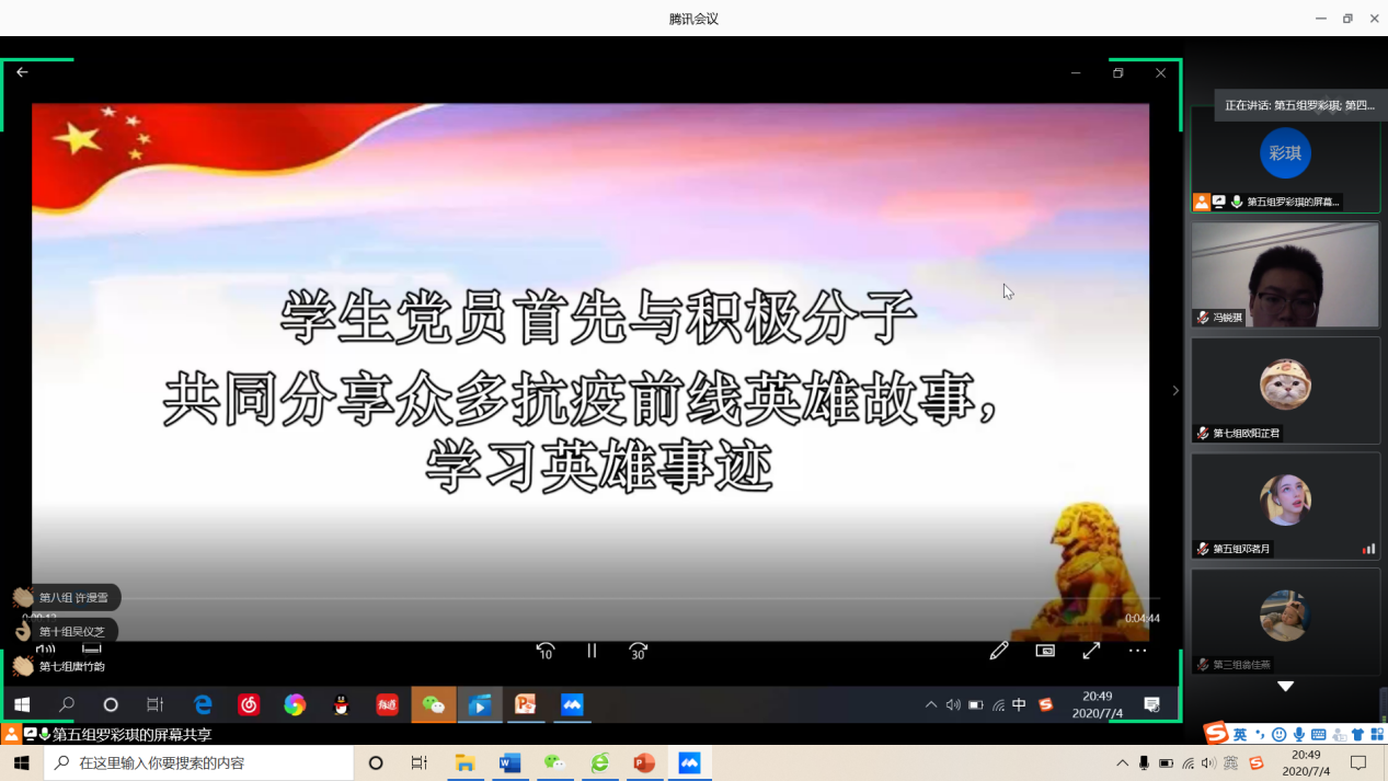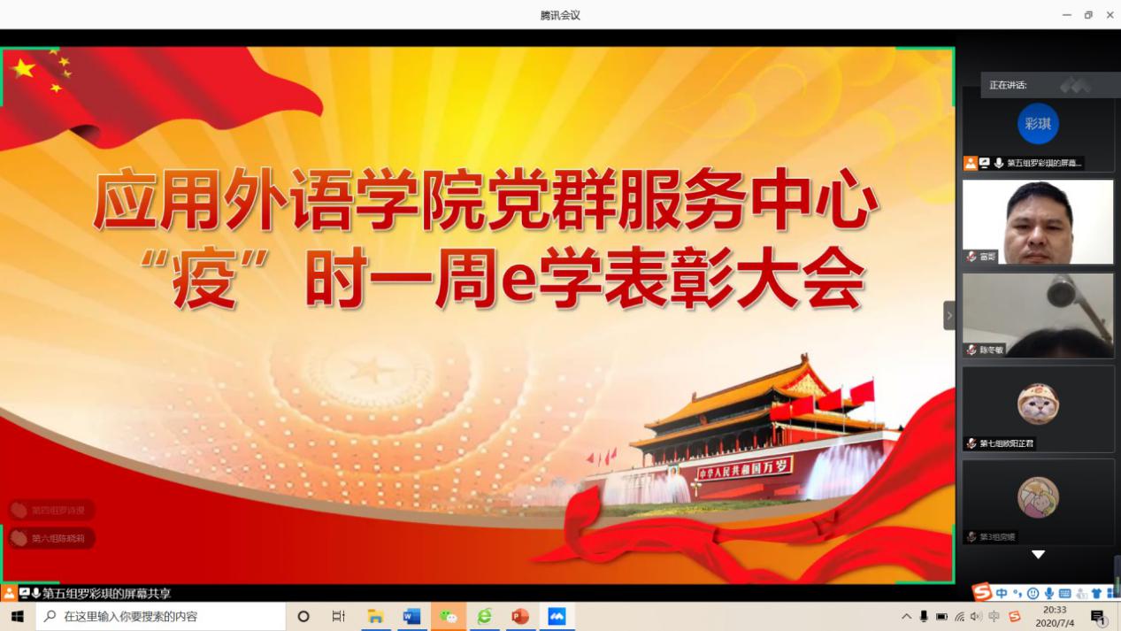 7月4日晚,应用外语学院“党群服务中心“疫”时一周e学表彰大会”线上举行,应用外语学院党总支书记李德富、党总支副书记罗春科、指导老师冯锐骐、获奖代表、党积极分子等一同参加本次大会。