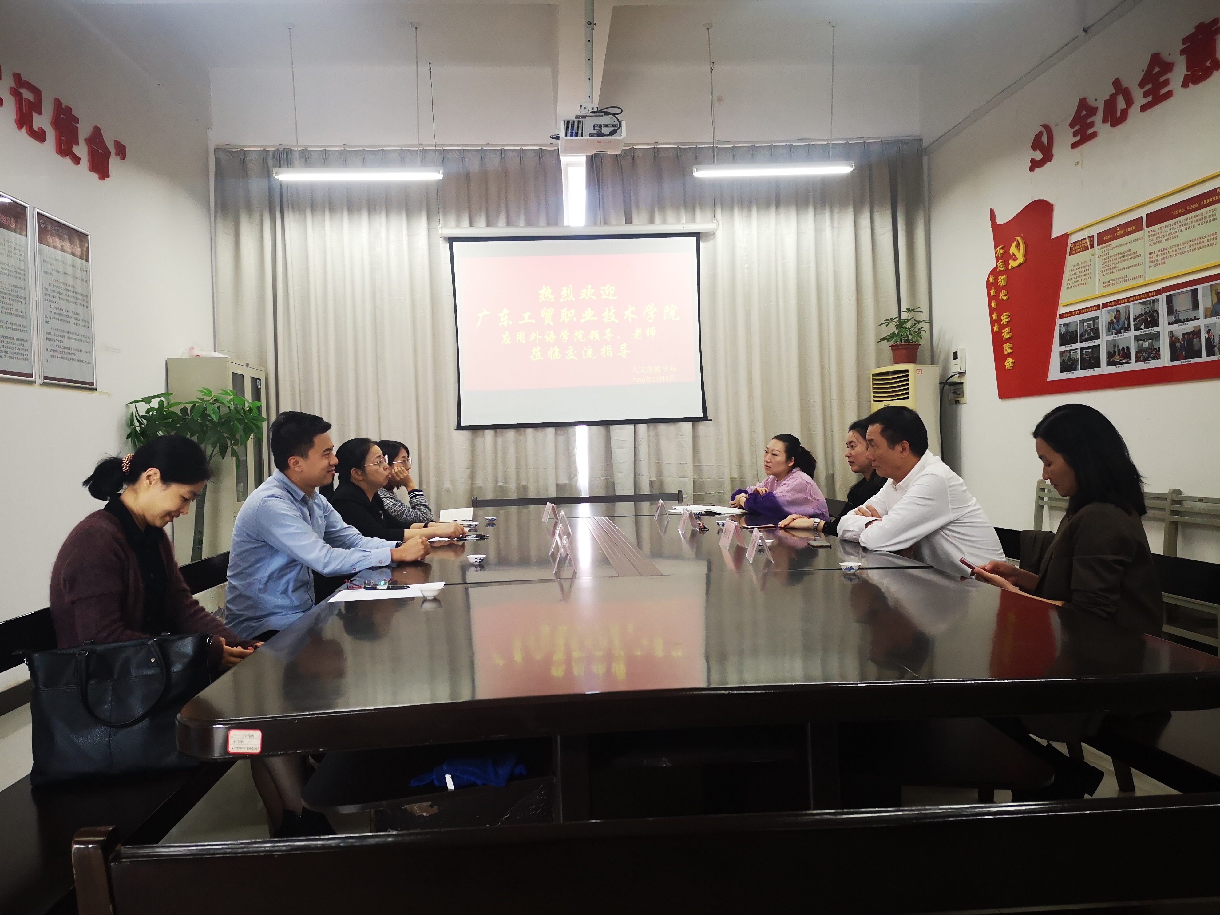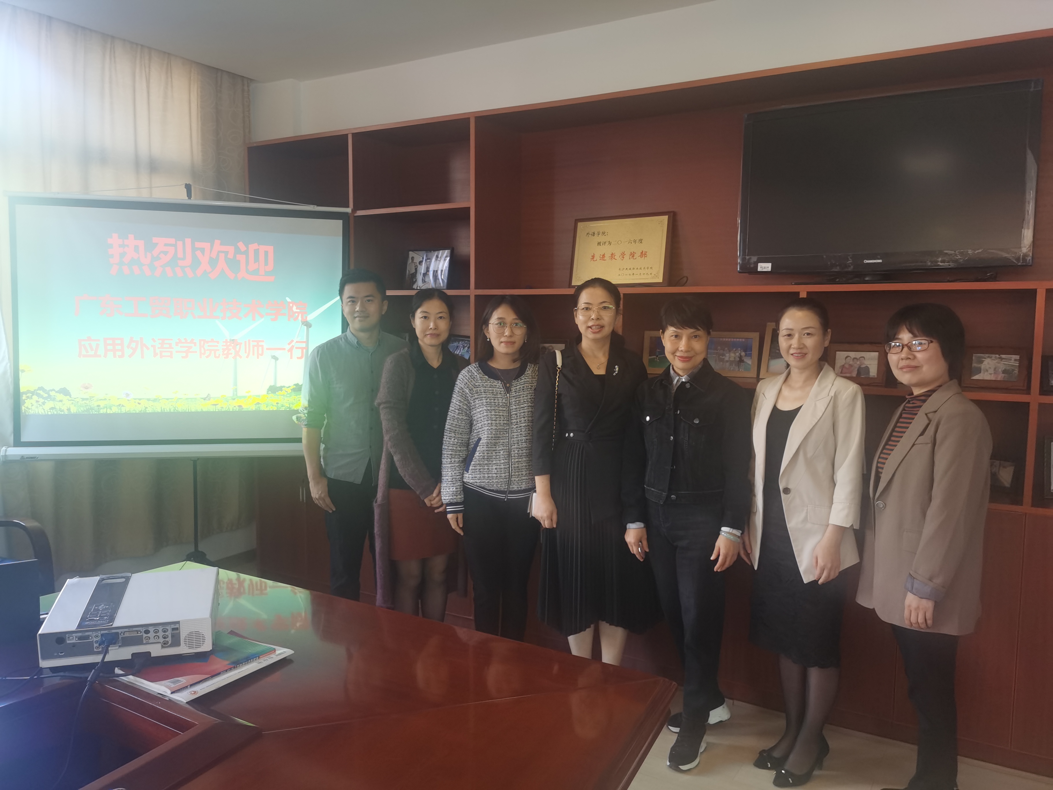长沙民政职业技术学院外语学院院长贺雪娟教授、总支副书记寻懋梅与老师们一起亲切的接待了我院领导、教师。介绍了外语学院应用外语服务专业群建设的成功经验、也对国赛连续取得优异成绩的培养方法进行交流。