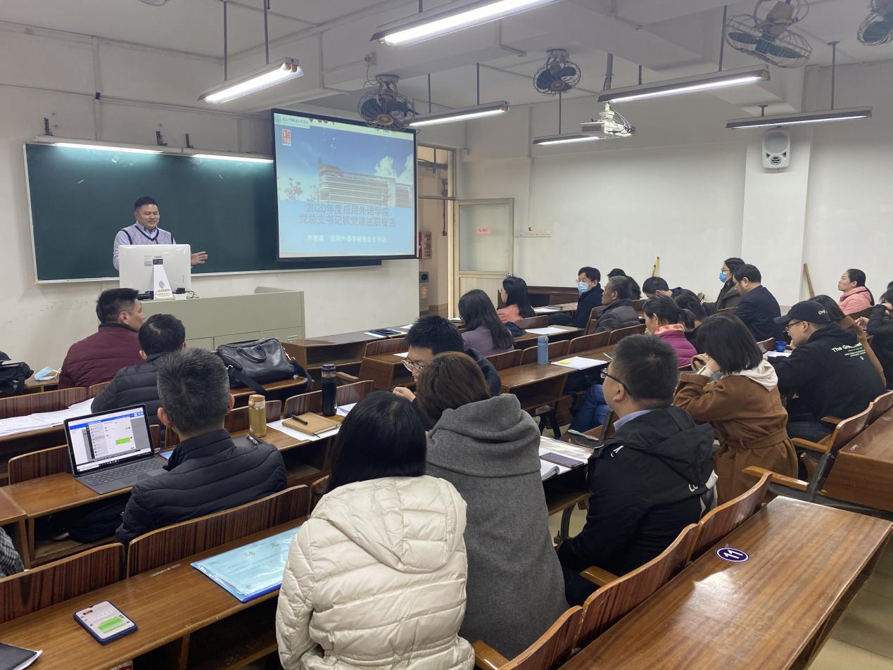 12月16日下午,应用外语学院在天河校区西区407召开全院教职工大会,学院党总支书记李德富、院长彭枚芳、党总支副书记罗春科、副院长杨国民、邓国栋以及全体教职工参加了此次会议。