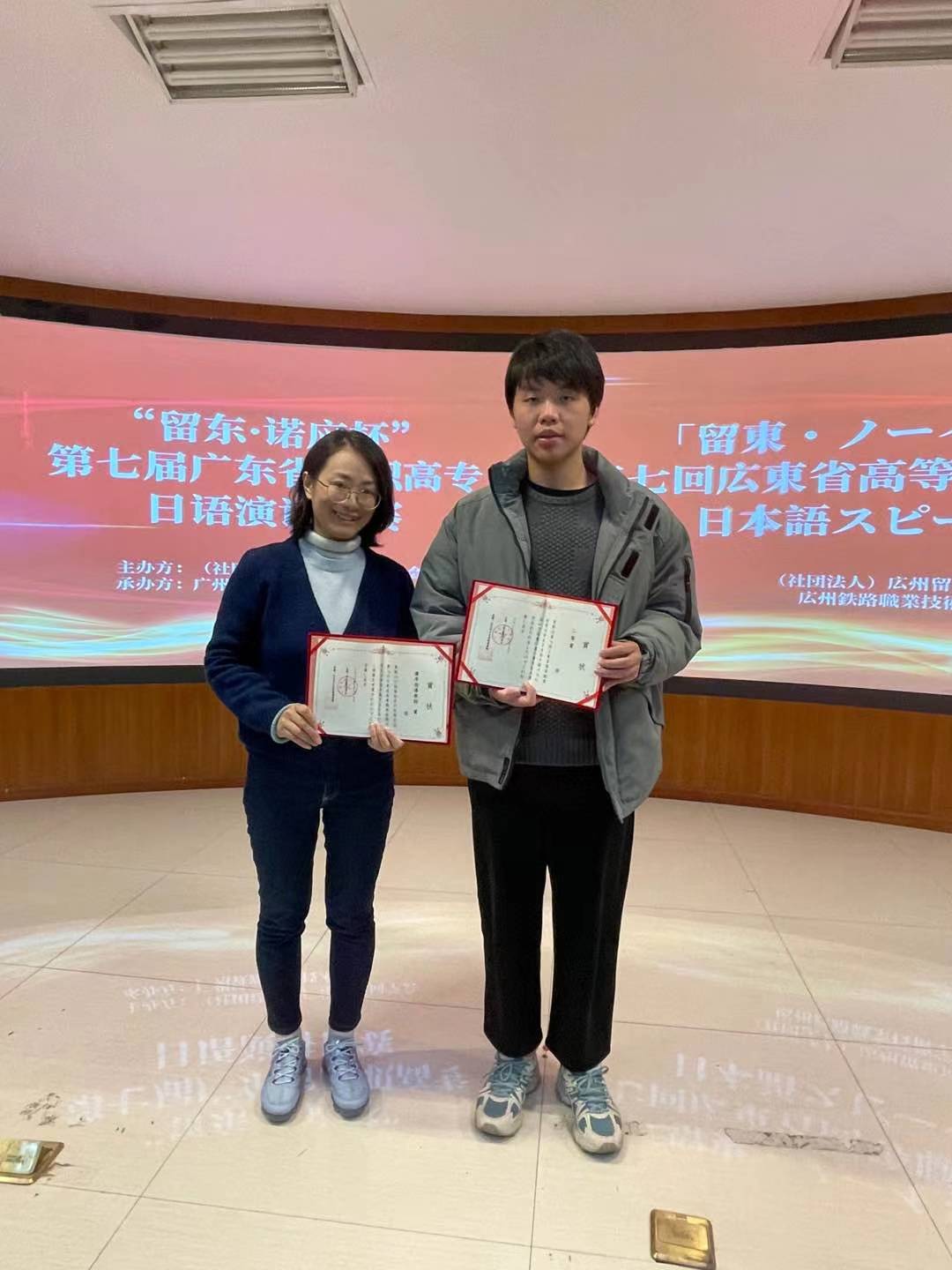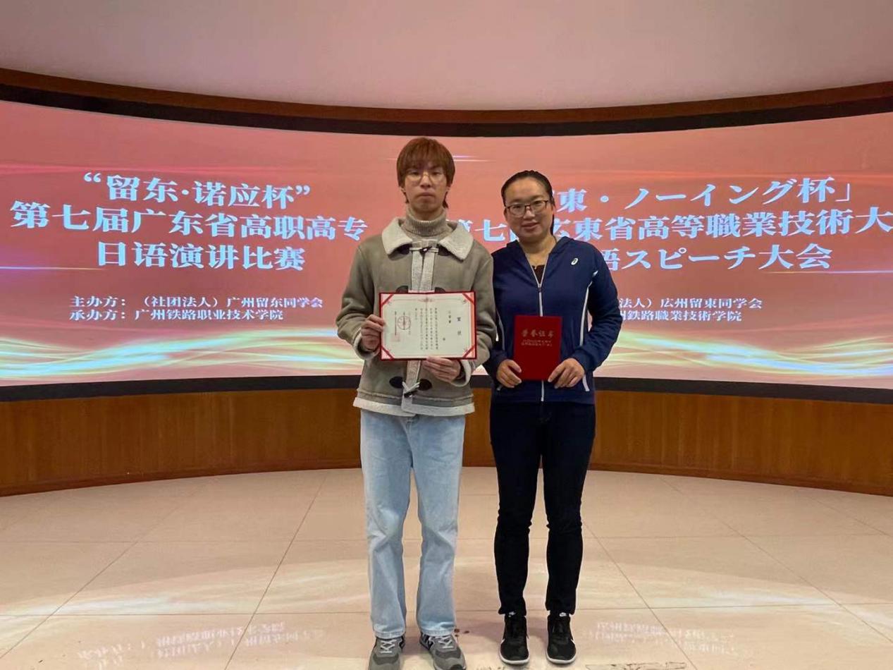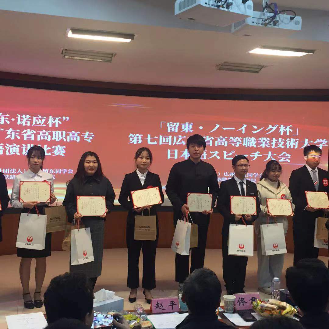 为推动高职高专日语教育教学改革,提高日语人才培养质量,激发广大学生对日语学习热情和兴趣,12月19日,由广州留东同学会主办、广州铁路职业技术学院承办、日本驻广州总领事馆协办的“留东・诺应杯”第七届广东省高职高专日语演讲比赛在广州铁路职业技术学院举行。应用外语学院2019级商务日语2班的李嘉辉同学和黄奕杰同学分别斩获二等奖和三等奖。熊岚、周丹两位老师荣获“优秀指导教师”奖。