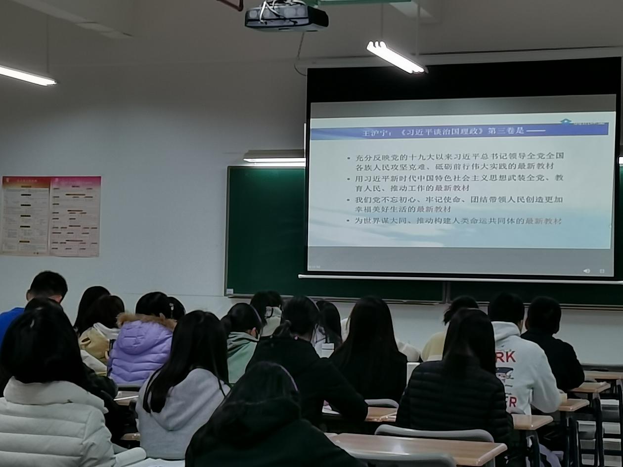 宴老师主要就该书第三卷的19个专题、学习的5点建议以及打开其卷的三把钥匙三个方面进行讲述。通过党课学习,同学们深刻了解到了习近平主席在治国理政方面上的理念,同时也感受到了国家领导人“人民至上”的服务意识以及“为人民而生,因人民而兴”的高尚情怀,习近平主席真正做到了与人民心心相印,同甘共苦。本次学习,让大家更坚定了跟着党走的坚定决心,成效显著。最后,老师号召我们积极学习《习近平谈治国理政》一书,并深入学习了解习近平主席在治国理政方面上的理念以及各项会议开展讲话的重要内容。