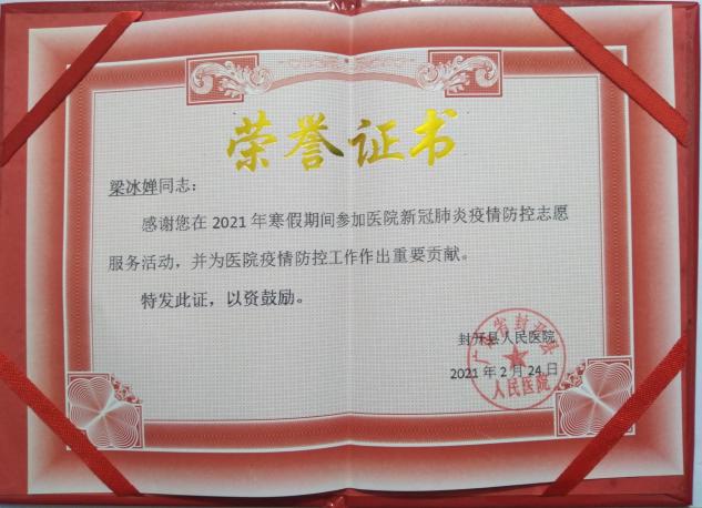 春节将至,国内多地出现散发病例和局部疫情,新冠肺炎疫情形势依然严峻。2月初网上一则关于封开县人民医院公开招募志愿者的通知吸引了梁冰婵的注意,想起疫情期间医护人员的辛苦劳累,梁冰婵在征得家人同意后,积极请求参加疫情防控志愿服务。她说:“我作为一名预备党员,有责任和义务,在家乡疫情防控中做一些力所能及的事。”