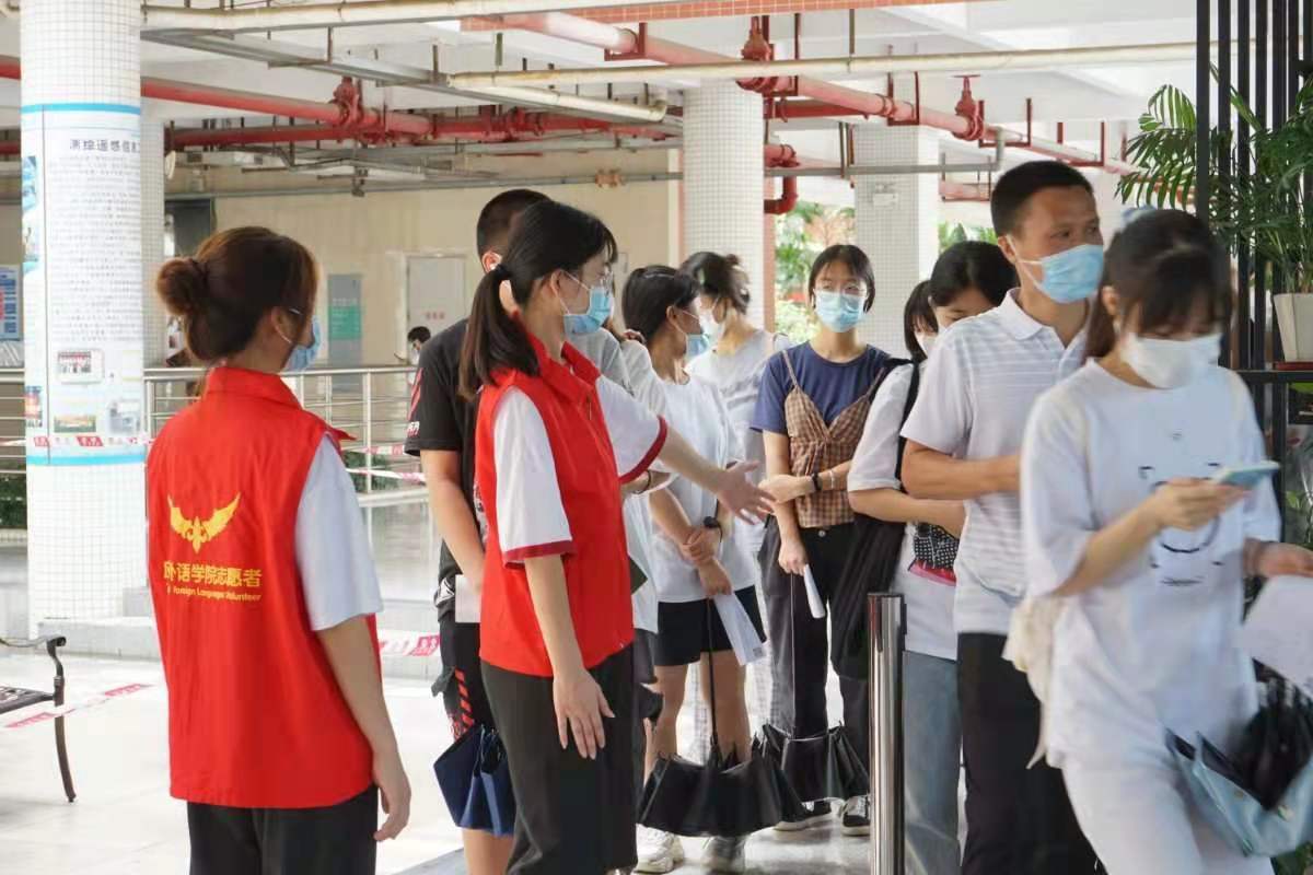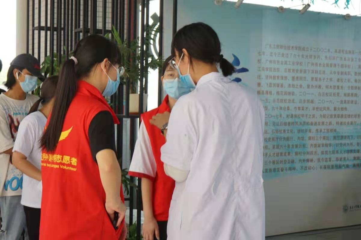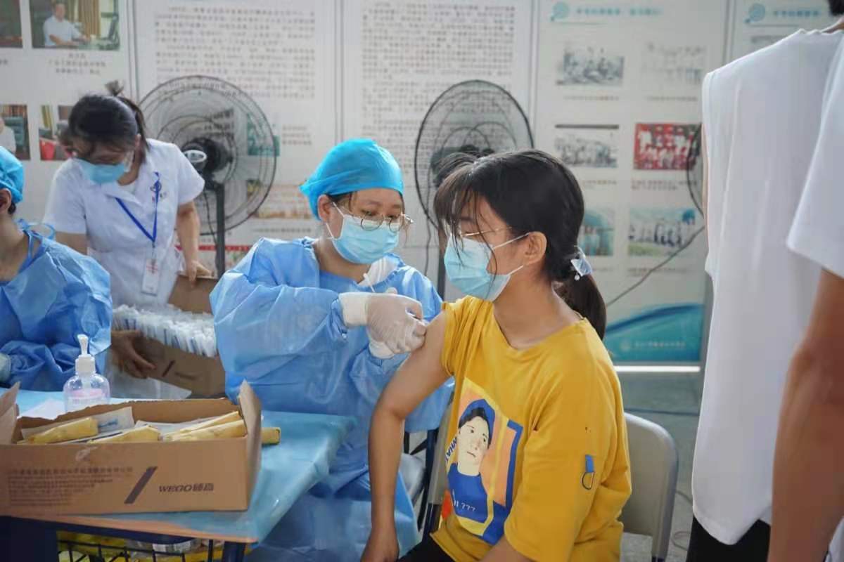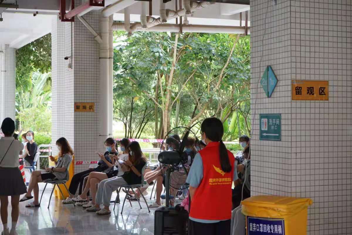 正是夏季炎热酷暑时,志愿者开展工作的同时早已汗流浃背。尽管如此,志愿者们依旧坚守工作岗位,在志愿者们的努力安排下,等待打疫苗的学生有序地排起了队伍并快速地前进着。医护人员面对着需要打疫苗的同学们,从容而又娴熟的给每位同学打上第二针疫苗。观察区的同学在自行观察30分钟无异常后,就在指定地点排队盖完章便完成了第二针疫苗的接种过程。