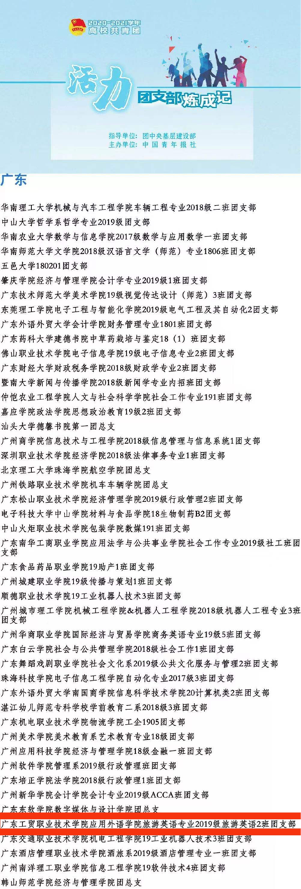 喜讯!近日,由团中央指导,中国青年报社主办2020—2021学年全国高校“活力团支部”遴选及展示活动进入全国终审。在学校团委的组织和支持下,在二级学院党总支和团委的指导下,我校应用外语学院19旅游英语2班团支部经校级申报、省级初评、展示点赞、全国终审等环节脱颖而出,获评2020-2021学年全国高校“活力团支部”,为我校争得了国家级荣誉,以实际行动和优异成绩献礼建党100周年。