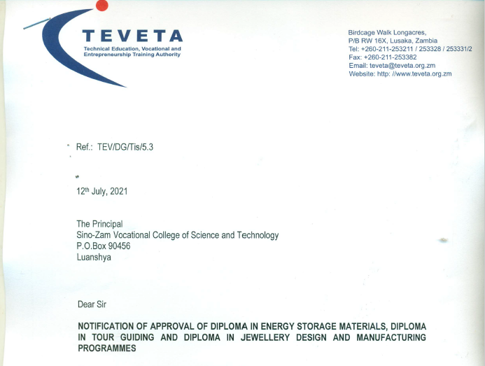 7月12日,由学校领导和教务处、对外交流合作处支持,应用外语学院罗春科主持研制,中国—赞比亚职业技术学院广东工贸分院(即我校赞比亚分院)申报的《导游专业》课程标准成功通过赞比亚职业教育与培训管理局(TEVETA)专业标准认证。