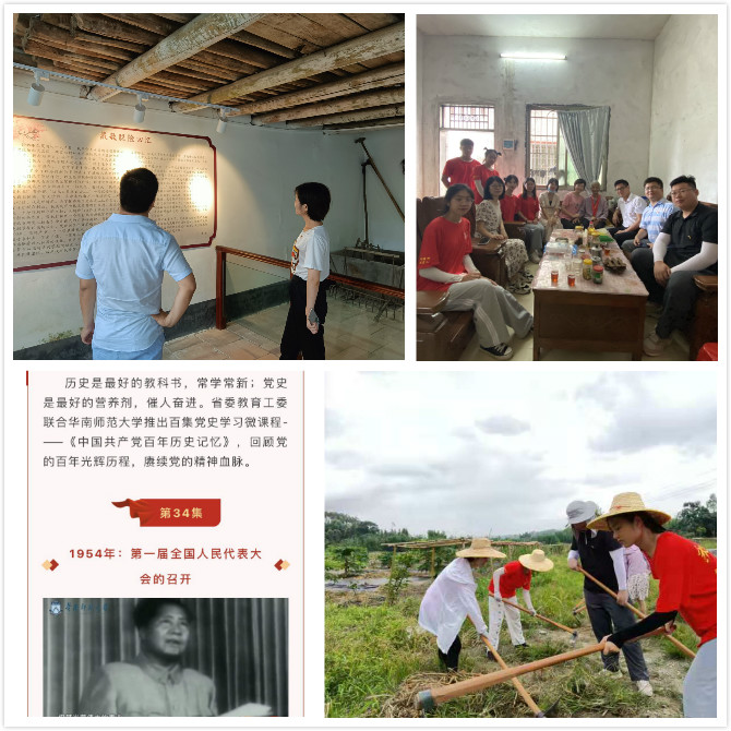 蔡丹敏:暑假之前,我对于党史的学习更多的源于党史书籍、文件精神学习、学习会议等等,学史明理、学史崇德、学史力行多是体现在思想上精神上。学史力行,怎么做?我应该行动起来!于是,我义无反顾参加了学院三下乡暑期社会实践服务队,在清远佛冈县开启了为期十二天的三下乡之旅。第一次三下乡,和同行的16名小伙伴一起同甘共苦,当中还有支部的另外三名党员,大家一门心思往走进基层,体验生活,实属难得!期间,我们一同到周边村部宣讲党史;环境打扫,田间劳作、社情调研;走访红色革命旧址、拜访老党员等活动,活动很充实,环境很艰苦,民风却淳朴,我们收获了满满的感动。当我们帮助农民伯伯收获农作物时,一句简单的“娃子们,辛苦了”让我们心里乐开了花。这是我们的学史力行实践行动,很有意义,让我对学党史有了新的认识。今后,我将继续不忘初心、牢记使命、永远跟党走!