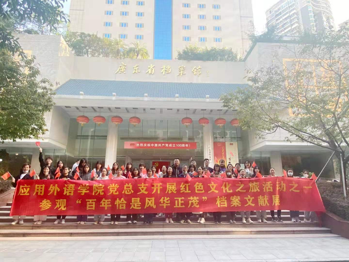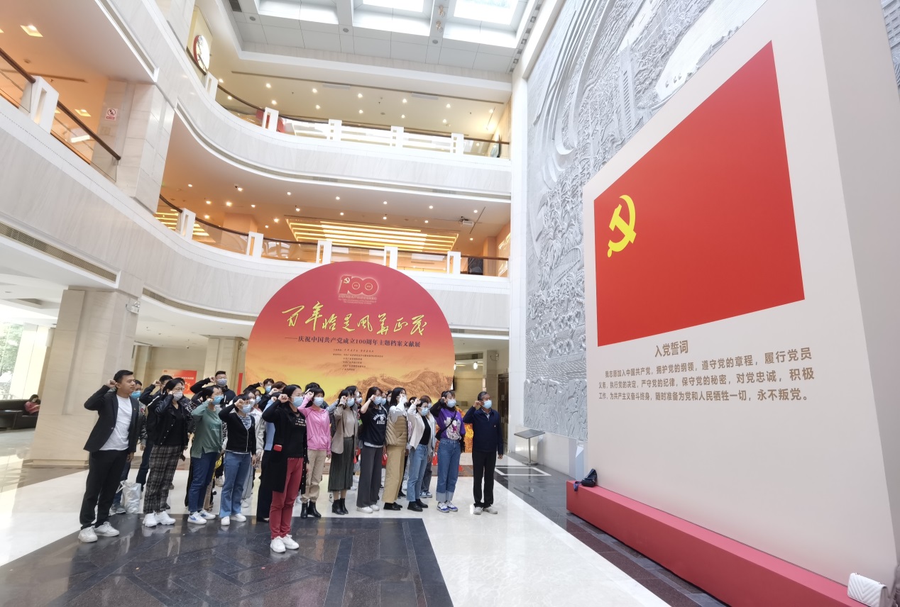 为庆祝中国共产党成立100周年,激发凝聚党员师生们全面建设社会主义现代化国家、实现中华民族伟大复兴中国梦的磅礴力量,11月11日下午,应用外语学院党总支组织全体教职工党员及在校学生党员前往广东档案局参观“百年恰是风华正茂”档案文献展,开展党史学习教育主题党日活动,重温入党誓词、参观了自建党以来中国共产党各个阶段的文献展,引导师生党员通过参观党的历史档案的形式,进一步了解中国共产党百年来在不同时期和各个方面所取得的辉煌成就。