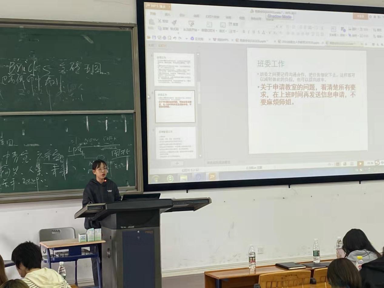 本次会议以提升学院精神面貌及规范学生行为为主题,首先由冯锐骐老师为班委介绍日常管理工作,条条有序的规章制度规范学生行为,以加强基础文明教育,培养各班学生良好的学风为重点,通过正反举例树立育人意识、法治意识、服务意识,充分发挥班委管理工作在我院的积极作用。