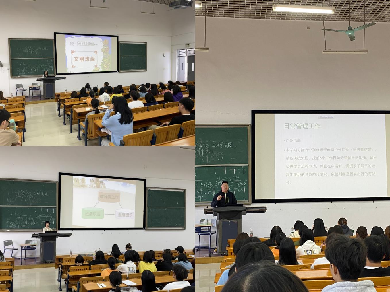 最后,实习辅导员及助理辅导员在两位老师的言论基础上发表自身见解,希望各班在学委带领下精诚团结、规矩准绳,争创先进文明班级。