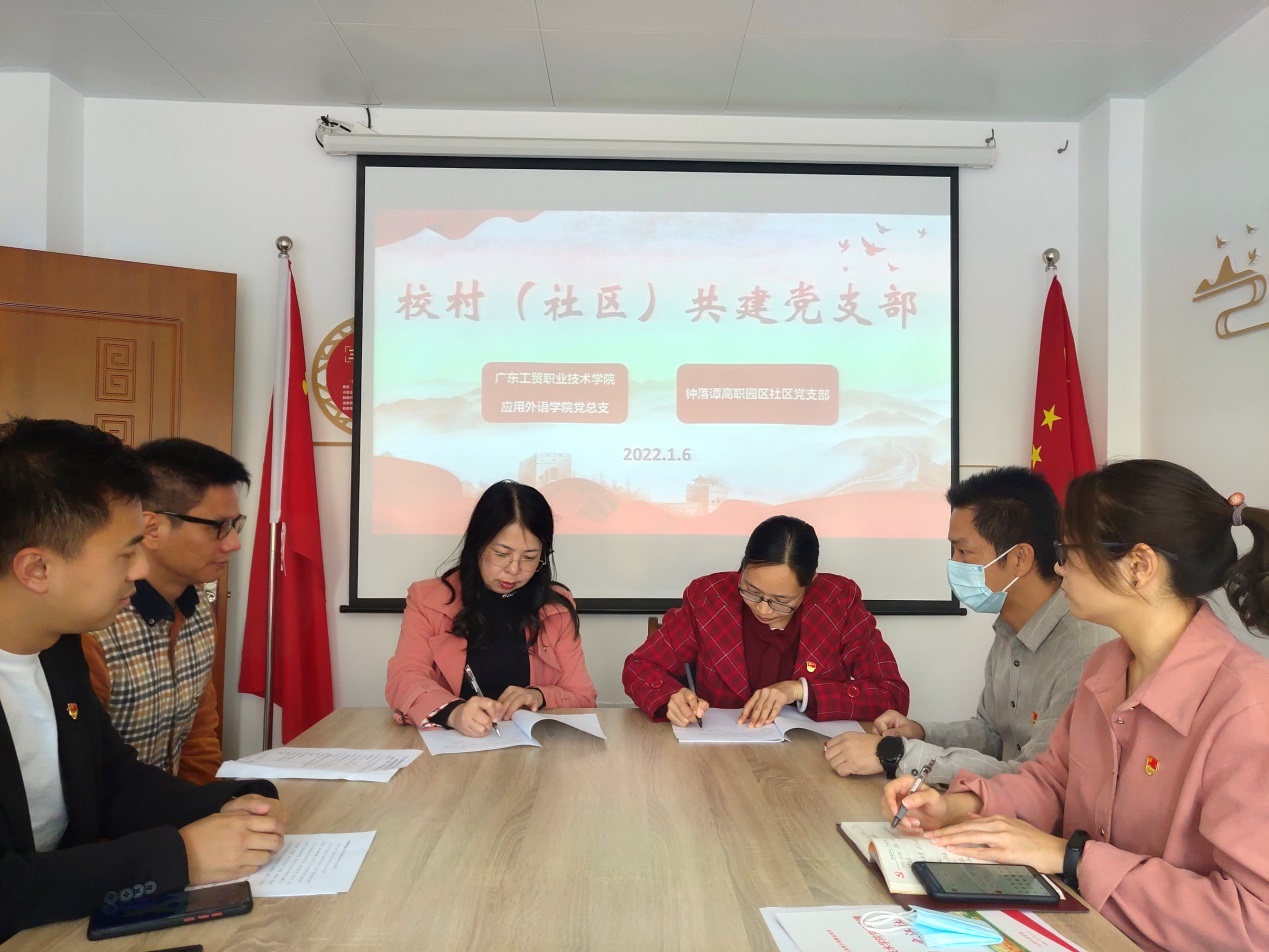 最后,双方代表签订党建引领校村(社区)共建协议。此次外语学院党总支与钟落潭高职园社区党支部的党建共建,是社校优势互补,是一次求真务实的创新探索。希望下一步在双方党组织的共同努力下,不断巩固和发展各自的一些特色做法,拓宽活动内容和范围,发挥各自的优势,实现学校基层党组织和村(社区)基层党组织资源共享、互促双赢、共同提高,推进党史学习教育和“我为群众办实事”的纵深发展,促进支部阵地建设。