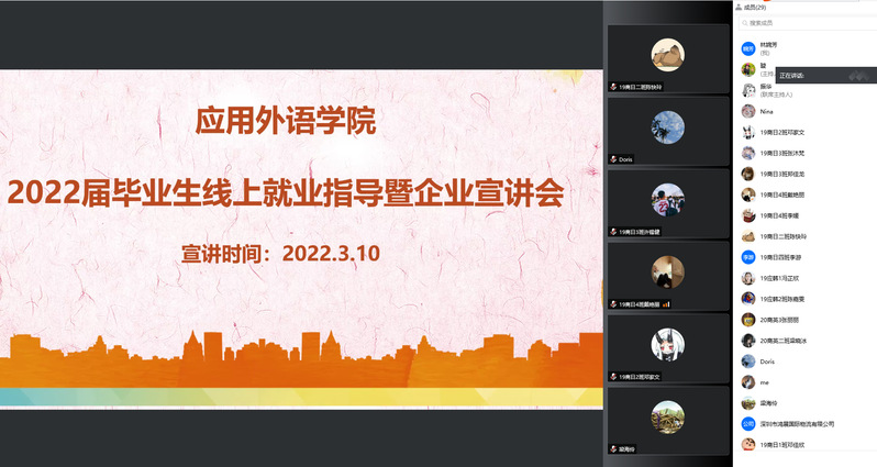 为推进2022届毕业生就业工作,切实做到疫情期间春招不打烊、就业服务不断线,应用外语学院于3月10日组织召开2022届毕业生线上就业指导暨企业宣讲会,邀请深圳市鸿展国际物流有限公司、广东壹健康产业集团股份有限公司、广州妙斯特胶带有限公司等3家企业进行线上宣讲,为毕业生提供精准就业指导服务。外语学院党总支副书记罗春科、毕业班班主任及相关辅导员、22届毕业生共同参加本次会议。