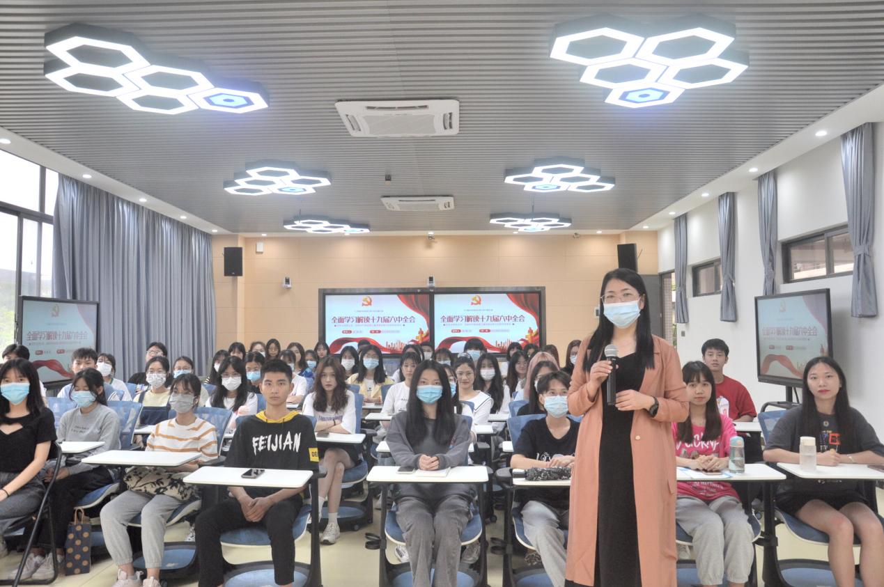 彭枚芳着重就“党的十九届六中全会概况”、“为何要总结党百年的重大成就和历史经验”、“中国共产党百年奋斗的辉煌成就”、“认真学习贯彻六中全会精神”等四项重要内容进行讲解,并为同学们详细阐述了党百年奋斗史的三个“需要”以及“四个伟大成就”。她强调,我们应从“党的百年奋斗中看清楚过去我们为什么能够成功,弄明白我们怎样才能成功”。