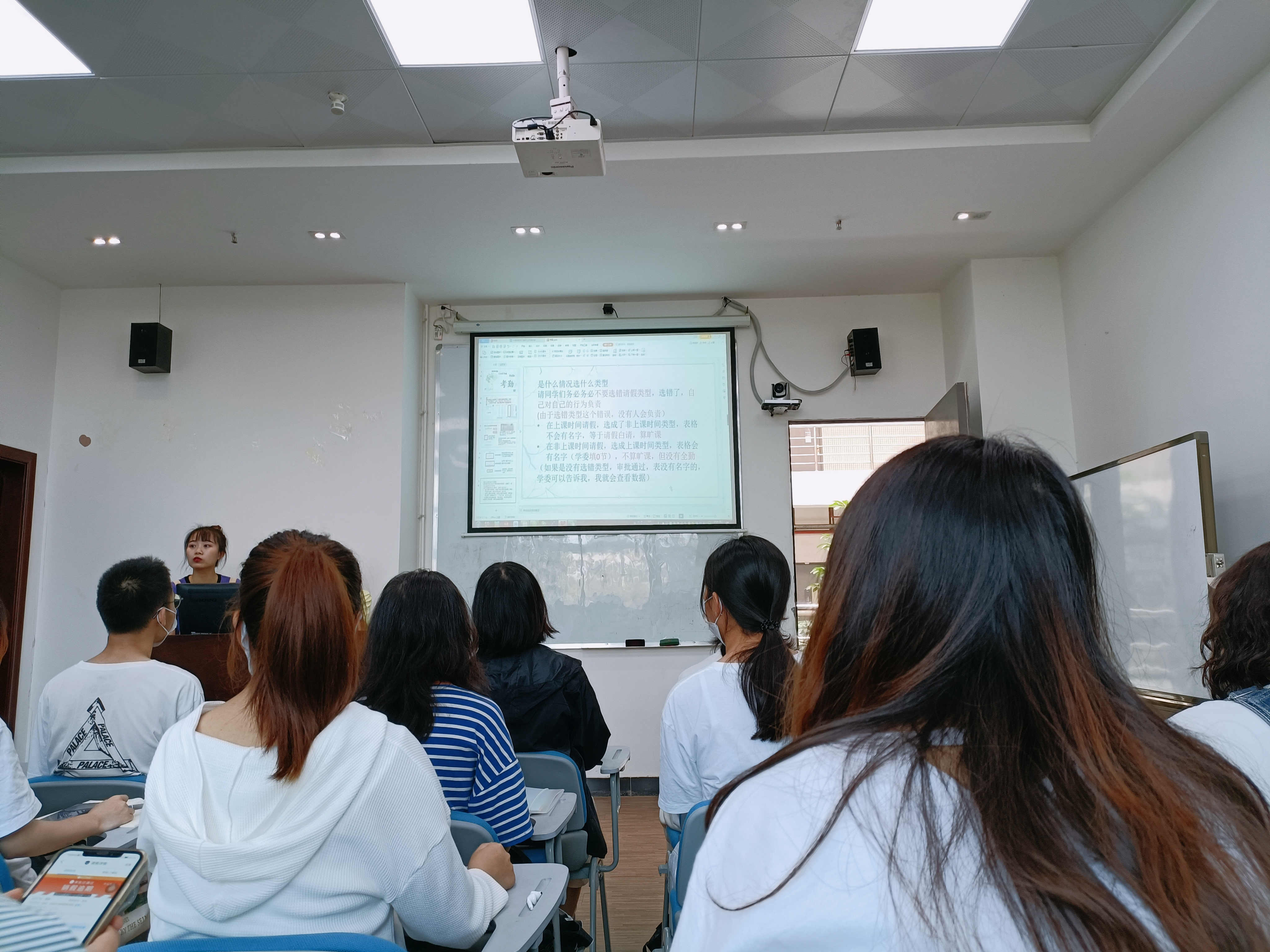 培训会上,学委们认真听课并做好学生请假说明的相应笔记。并及时反映工作中遇到的棘手问题。