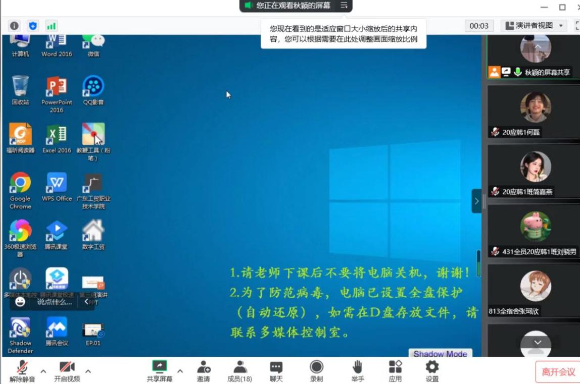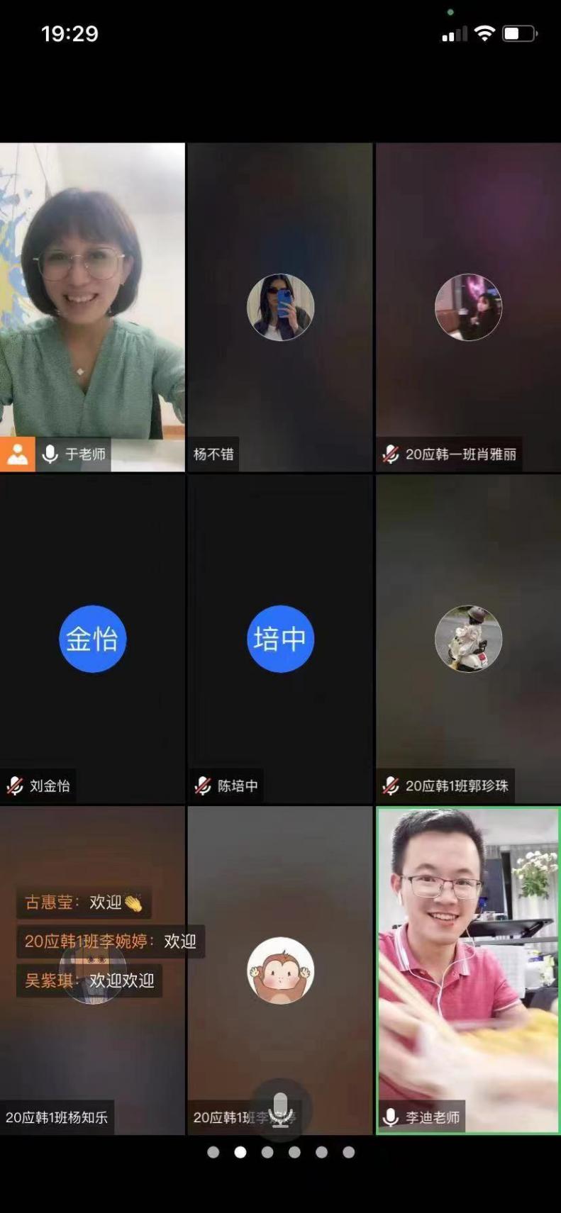 此外,分管辅导员李迪老师、班主任于超群老师、20韩语1班的任课老师与该班同学也做到了迅速反应,高度配合学校的疫情防控工作。为保证同学们安全平稳度过隔离观察期,李迪老师全程联动学校疫情防控办、物业公司、总务处等部门跟进好在寝室健康监测全体同学的后勤服务保障工作;于超群老师与李迪老师于健康监测第一天晚上及时共同组织召开了20韩语1班线上班会,详细关心了全班同学健康、餐饮、住宿、心理等状况,并叮嘱全班同学保持良好心态,积极配合,合理作息;江秋颖老师、王宗喆老师和曹丽丹老师在接到学院教学片紧急通知后临危不乱、临机应变,将线下课堂及时转变为线上课堂,即使面对空无一人的教室也依然站好教师岗位,按原课程表在课室通过学校网络教学平台按时上课,保证学生完成教学任务,高效做到“隔离不停课”。而在此次为期3天的网格化隔离中,20韩语1班全体同学积极配合遵守防疫规定,继续保持积极昂扬的精神状态,安心在健康监测的宿舍度过医学观察期。
