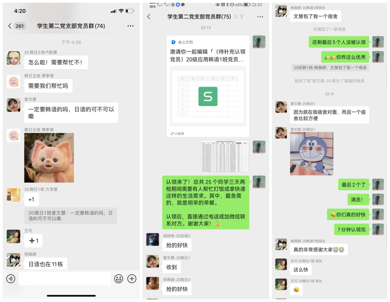 参与此次帮扶行动的党员们也表示:“大家同是外语学院大家庭的一员,当同学需要帮助时,冲在第一线为同学们排忧解难、提供自己力所能及的帮助是我们党员义不容辞的责任;同时,此次‘隔离不隔爱’志愿帮扶行动也让自己对党员身份有更深刻的理解。”