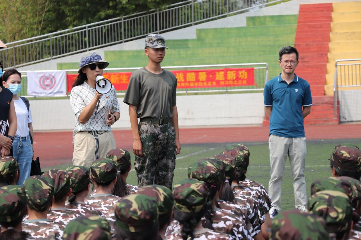 训练场上,新生们动作规范整齐,口号响亮,展现出朝气蓬勃的精神风貌。成海涛向带训教官详细了解了此次新生军训的整体情况,询问分管辅导员军训期间安全保障、医疗卫生等工作情况,对外语学院参训新生表现出来的良好精神面貌给予了高度赞扬,对承担军事训练任务的教官表示衷心感谢。彭枚芳表示,希望同学们磨炼坚强的军人意志,提升国防观念,训练出强壮的身体以报效社会,报效祖国;同时还提醒同学们要注意休息,多喝水,保重身体,圆满完成军训任务。