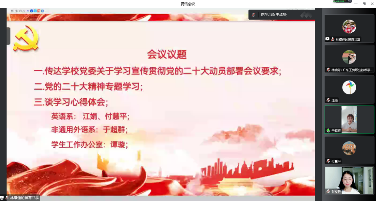 党的二十大是一次高举旗帜、凝聚力量、团结奋进的大会,在党和国家发展进程中具有极其重大的历史意义。为进一步传达学习贯彻党的二十大精神,11月1日,应用外语学院召开第二期党的二十大精神线上专题学习会议。会议由外语学院院长彭枚芳主持,全体教职工参与会议。