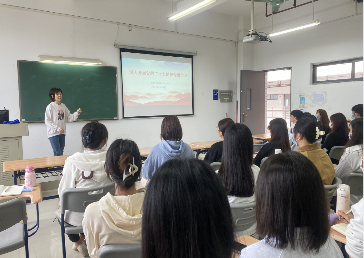 11月8日下午,外语学院学生第二党支部于明德楼1-613开展党的二十大精神专题学习,支部书记王燕玲带领在校学生党员共同学习。会上,王燕玲传达学校党委关于学习贯彻党的二十大精神动员部署会议要求,带领全体党员深入学习了党的二十大通过的《中国共产党章程》,具体介绍了《中国共产党章程(修正案)》诞生记,中国共产党章程(2022年新旧对照版)具体内容。