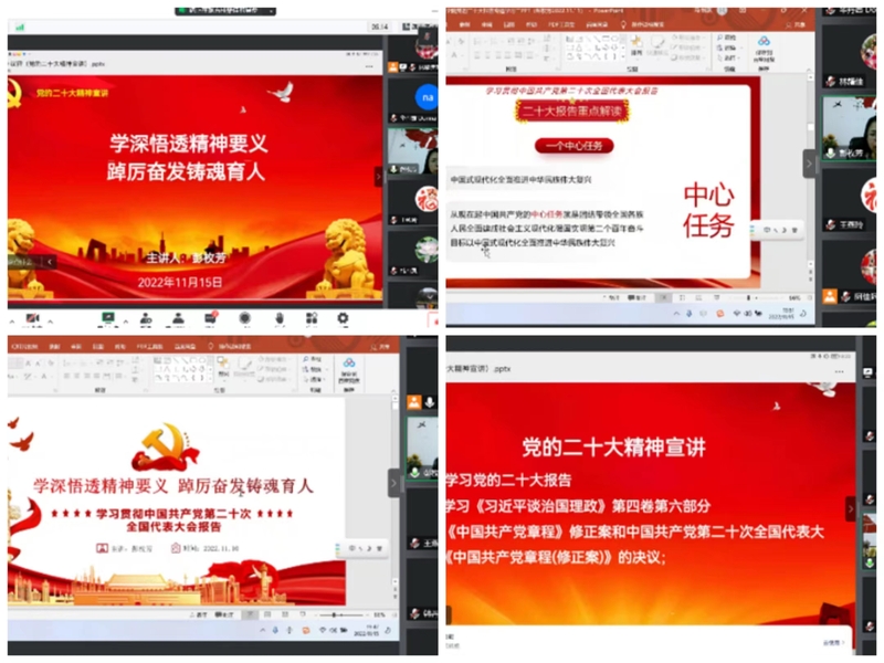 应用外语学院教师第二党支部高度重视学习宣传贯彻党的二十大精神,把学习好、宣传好、贯彻好党的二十大精神作为首要政治任务。2022年11月15日下午三点,应用外语学院“学习宣传贯彻党的二十大精神”宣讲会如期举行。宣讲会采用腾讯会议直播方式,支部书记彭枚芳主讲,支部全体党员在线聆听。